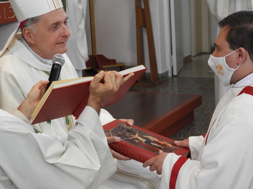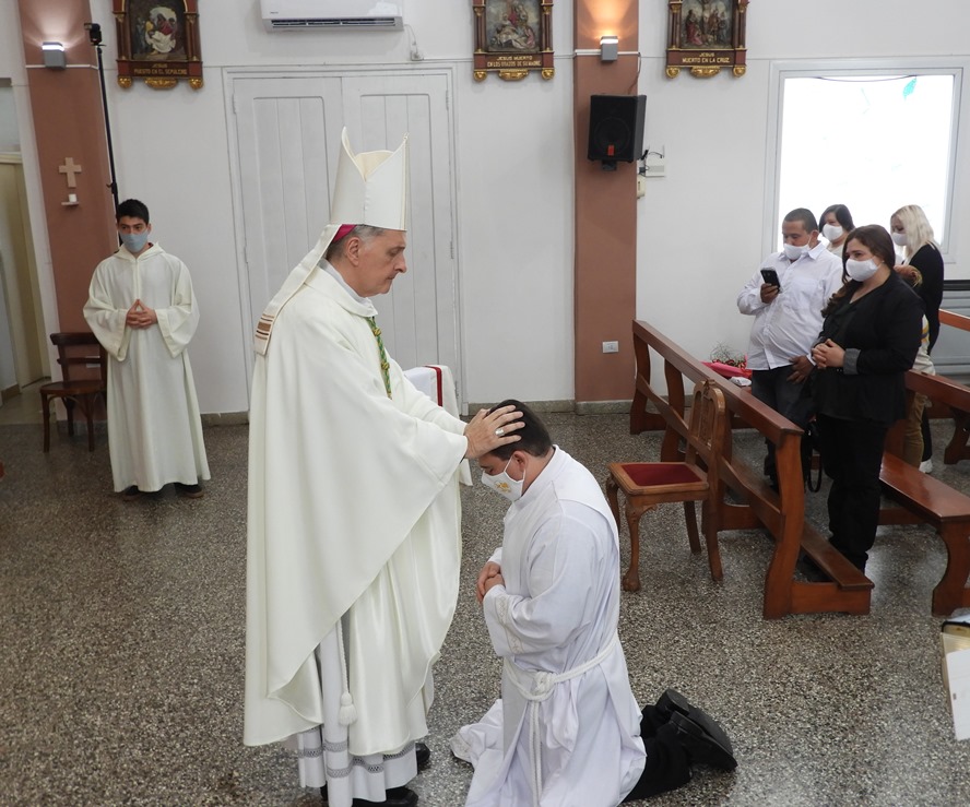 Luego del rito de ordenación, con su punto culminante de imposición de manos y oración de ordenación, el flamante diácono fue revestido con los ornamentos propios de su orden, estola cruzada y dalmática, por los padres Perez Cadierno y Ariel Palanga.