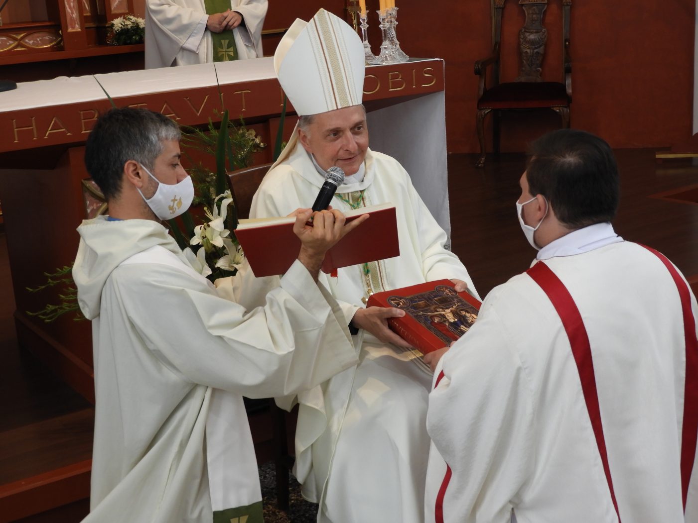 Luego del rito de ordenación, con su punto culminante de imposición de manos y oración de ordenación, el flamante diácono fue revestido con los ornamentos propios de su orden, estola cruzada y dalmática, por los padres Perez Cadierno y Ariel Palanga.