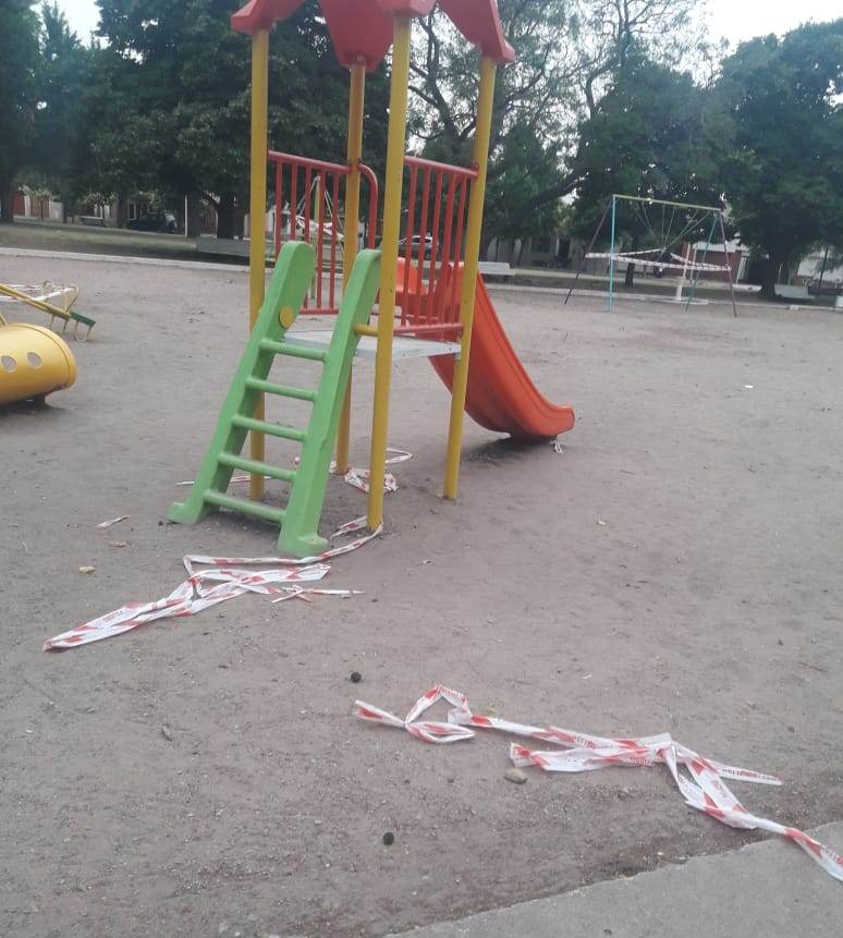 Pocas horas después de los anuncios realizados por el intendente Municipal, Mariano Barroso, y de la colocación de las cintas restrictivas en el sector de juegos en plazas y parques -ya que está prohibido el uso de los mismo y la permanencia en los espacios públicos- las mismas fueron violentadas en comportamiento vandálico, en este caso en Plaza Italia.