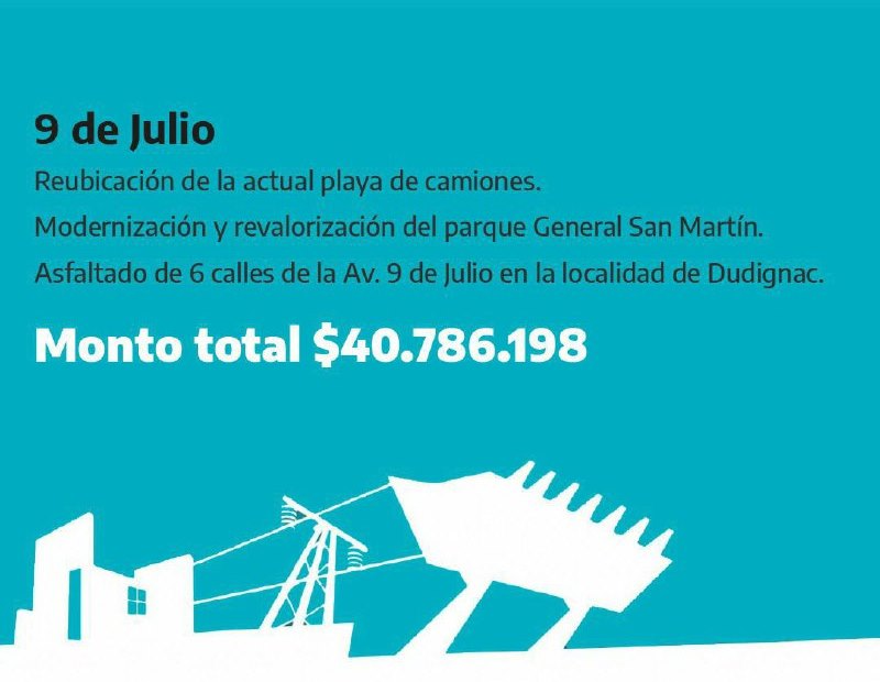 En 9 de Julio se proyecta: reubicar la playa de camiones, levantar un cerco perimetral, con portón, calzada, cabina de acceso e iluminación, por un total de $11.037.143,79; modernización y revalorización del parque Gral. San Martín, incorporando nuevos juegos, equipamientos, luces y veredas, por $15.179.115,42; y para la localidad de