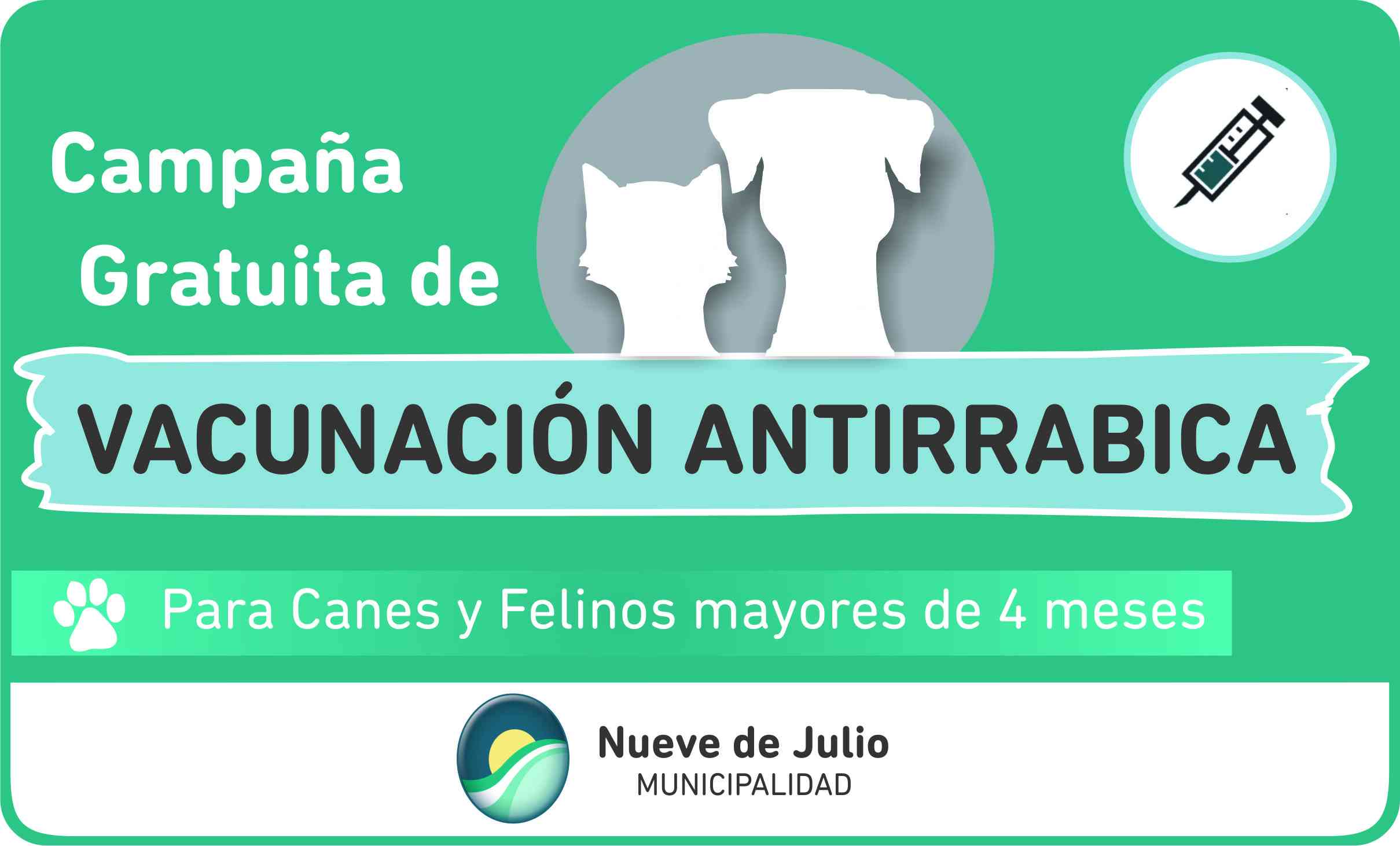 La Dirección de Albergue Canino de la Municipalidad de Nueve de Julio dará inicio a la campaña anual y gratuita de vacunación antirrábica, dirigida a canes y felinos mayores de 4 meses de edad, este próximo viernes 16, en su sede de calle la Rioja al 100.
