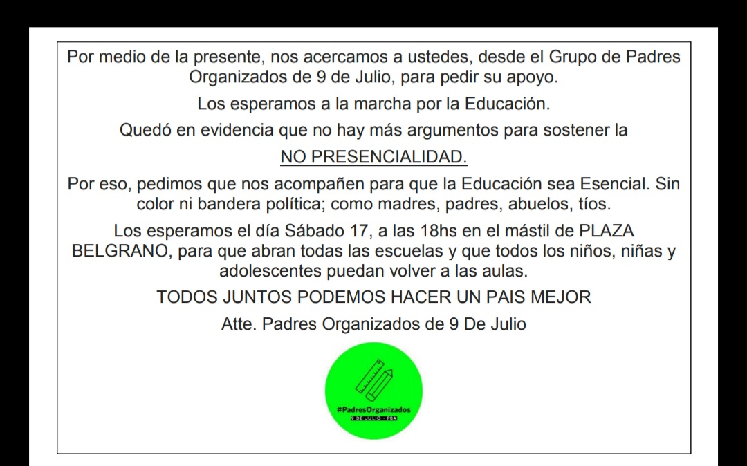 Padres organizados de Nueve de Julio se pronunciarán, otra vez, en plaza Belgrano.