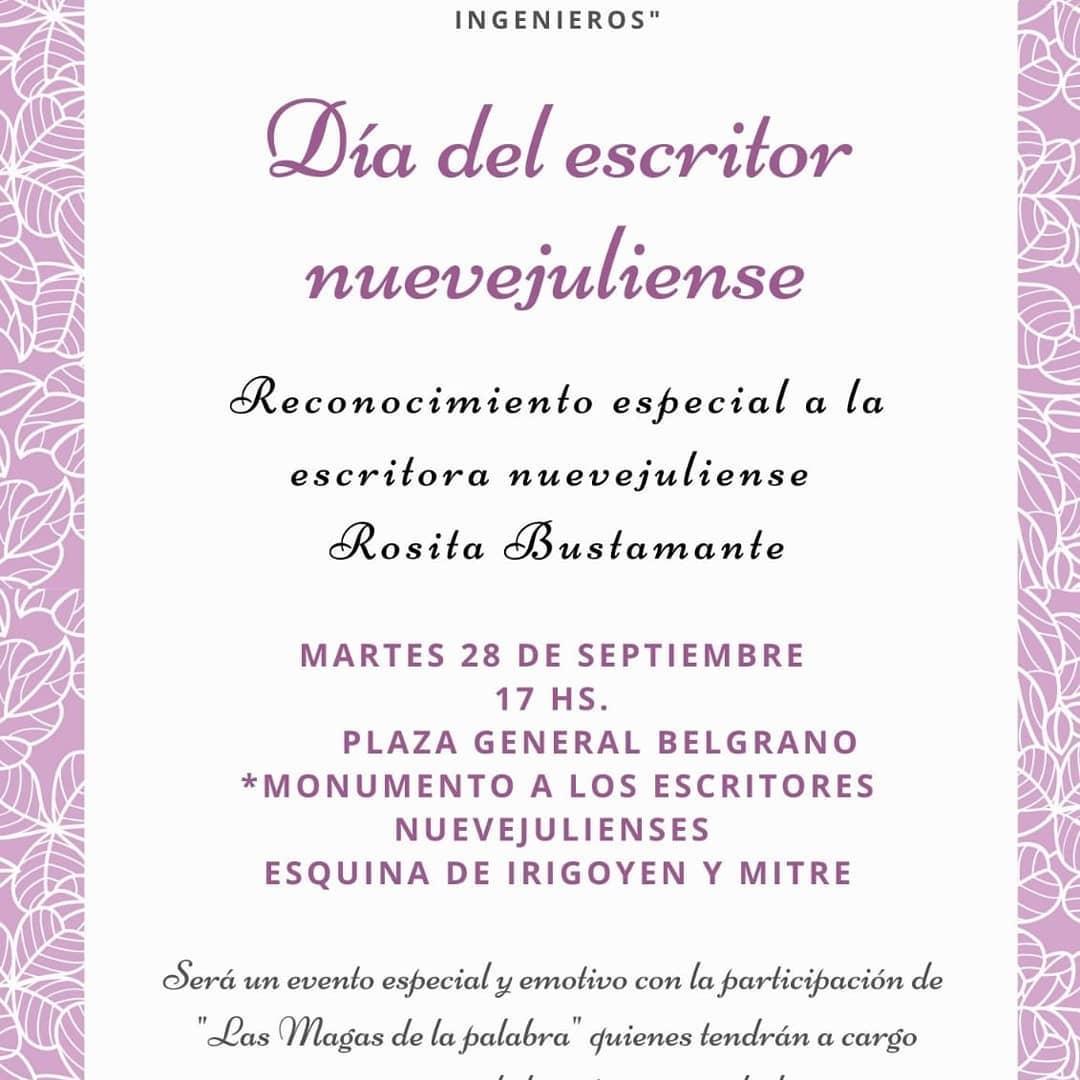 GeneralEn el día del Escritor nuevejuliense será homenajeada Rosa BustamanteLo explicó Elizabeth Urso, Directora de la Biblioteca Popular, José Ingenieros y será el martes 28 a las 17 en Plaza Belgrano frente al Monumento a los Escritoresmiércoles 22 de septiembre de 2021 0FacebookTwitterWhatsAppEmailPrint - Advertisement -- Advertisement -- Advertisement -TagsGeneralFacebookTwitterWhatsAppEmailPrint Noticias relacionadas General Veintidós policías del distrito nuevejuliense fueron reconocidos por su labor en una ceremonia en Pehuajó General Pehuajó fue sede del acto regional por el 204° Aniversario de la Policía Bonaerense General La temporada de verano en las piletas del Club Atlético suma bañeros en dos semanas DEJA UNA RESPUESTA Cancelar respuesta Comentario: Por favor ingrese su comentario! Nombre:* Por favor ingrese su nombre aquí Correo electrónico:* ¡Has introducido una dirección de correo electrónico incorrecta! Por favor ingrese su dirección de correo electrónico aquí Sitio web: Guardar mi nombre, correo electrónico y sitio web en este navegador la próxima vez que comente. ΔÚltimas noticias Veintidós policías del distrito nuevejuliense fueron reconocidos por su labor en una ceremonia en Pehuajó General jueves 18 de diciembre de 2025 Pehuajó fue sede del acto regional por el 204° Aniversario de la Policía Bonaerense General jueves 18 de diciembre de 2025 La temporada de verano en las piletas del Club Atlético suma bañeros en dos semanas General jueves 18 de diciembre de 2025 Kicillof: la Reforma Laboral es lo más parecido a la Ley Banelco General jueves 18 de diciembre de 2025 Masiva marcha de la CGT en Plaza de Mayo contra la flexibilización laboral: “No podemos entregar nuestros derechos” General jueves 18 de diciembre de 2025