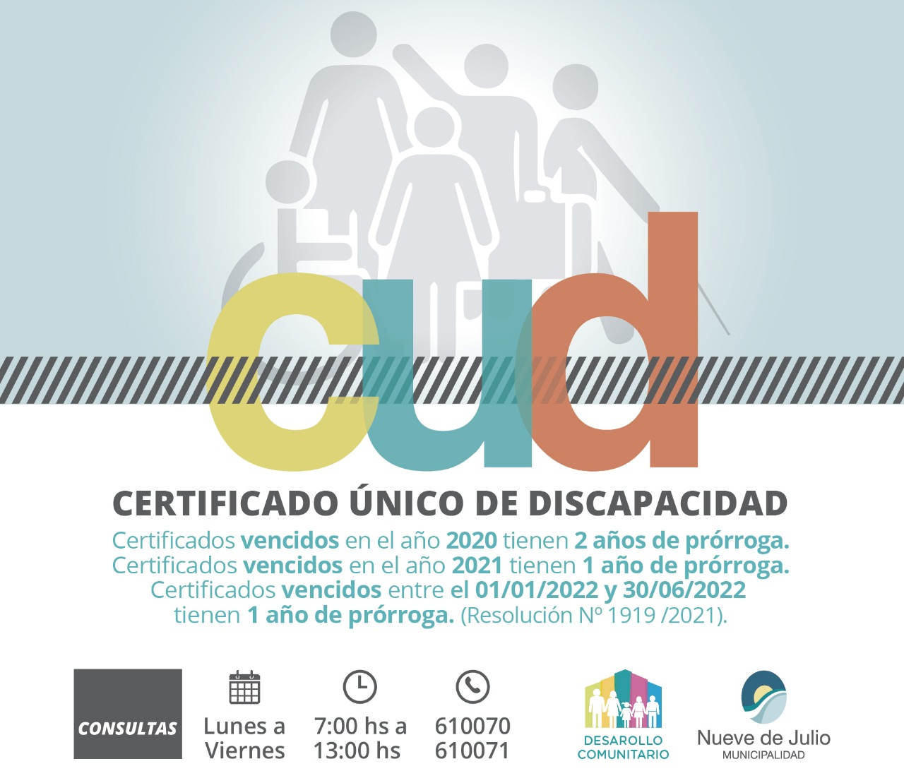 La Dirección de Discapacidad de la Municipalidad de Nueve de Julio informa que, de acuerdo a la reciente publicación en el Boletín Oficial de la Resolución 1919/2021, se han prorrogado los vencimientos de los Certificados Únicos de Discapacidad; de la siguiente manera: