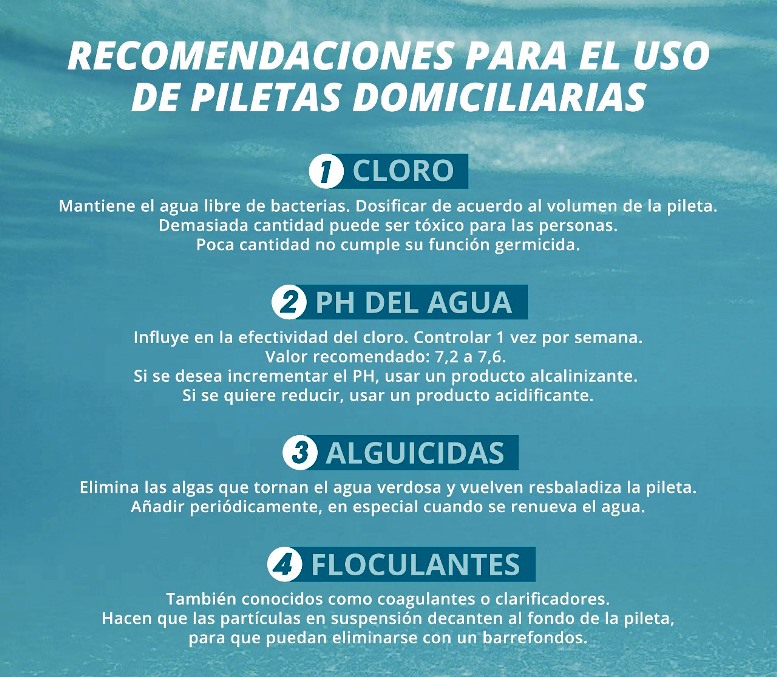 El nivel de cloro debe mantenerse en 2 partes por millón (ppm). No es aconsejable que se encuentre en un valor mayor, ya que puede resultar tóxico para las personas. Los bajos niveles de cloro, por otra parte, pueden permitir el desarrollo de bacterias.