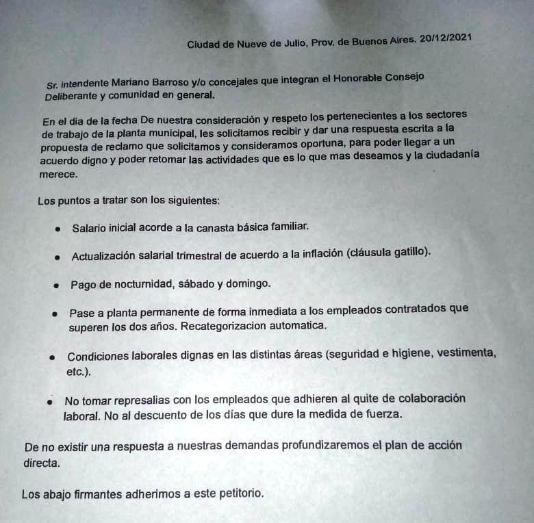 GeneralMunicipales autonvocados reclaman aumento salarial y se manifiestan frente al Palacio Comunal nuevejulienseLos servicios estarán restringidos hasta lograr el objetivo y mañana serán recibidos por el intendente Mariano Barrosolunes 20 de diciembre de 2021 0FacebookTwitterWhatsAppEmailPrint - Advertisement -- Advertisement -- Advertisement -FacebookTwitterWhatsAppEmailPrint Noticias relacionadas General Esteban Naudín: “Es momento de dejar la queja, pasar a la acción y hacer la diferencia en Nueve de Julio” General Talleres gratuitos de costura y manejo de máquinas de coser arrancan con gran convocatoria General Nace Codo a Codo: La pasta artesanal que une inclusión y sabor con amor en Nueve de Julio DEJA UNA RESPUESTA Cancelar respuesta Comentario: Por favor ingrese su comentario! Nombre:* Por favor ingrese su nombre aquí Correo electrónico:* ¡Has introducido una dirección de correo electrónico incorrecta! Por favor ingrese su dirección de correo electrónico aquí Sitio web: Guardar mi nombre, correo electrónico y sitio web en este navegador la próxima vez que comente. ΔÚltimas noticias Esteban Naudín: “Es momento de dejar la queja, pasar a la acción y hacer la diferencia en Nueve de Julio” General viernes 6 de marzo de 2026 Talleres gratuitos de costura y manejo de máquinas de coser arrancan con gran convocatoria General viernes 6 de marzo de 2026 Nace Codo a Codo: La pasta artesanal que une inclusión y sabor con amor en Nueve de Julio General viernes 6 de marzo de 2026 Programa Envión: nuevos horarios y actividades para jóvenes de todo el distrito General viernes 6 de marzo de 2026 La Suprema Corte de Justicia de la Provincia de Buenos Aires creó el Registro de Casos de Género General viernes 6 de marzo de 2026