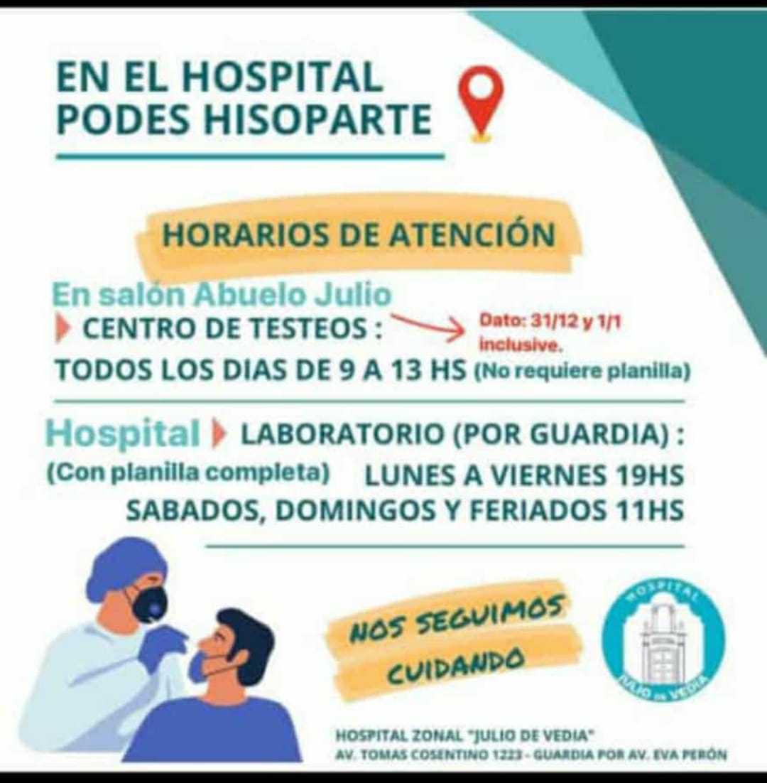 En el Hospital Julio de vedia se realizarán durante todo el fin de semana, incluido este vierens 31, testoes.