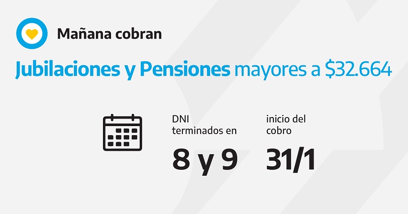 Las sucursales bancarias habilitadas atenderán por ventanilla a jubilados, jubiladas, pensionados y pensionadas con documentos terminados en 8 y 9 cuyos haberes SUPEREN la suma de 32.664 pesos.