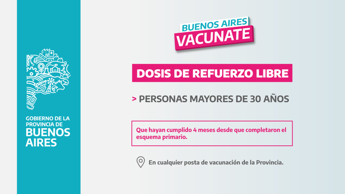 El gobernador Axel Kicillof anunció que desde este miércoles habrá vacuna de refuerzo libre contra el coronavirus, es decir sin turno, para todos los bonaerenses mayores de 30 años cuyo esquema inicial de dos dosis haya cumplido cuatro meses o más. Asimismo, el próximo viernes 25 de febrero se realizará la segunda edición de la “Noche de las Vacunas”, luego del éxito de la primera edición.