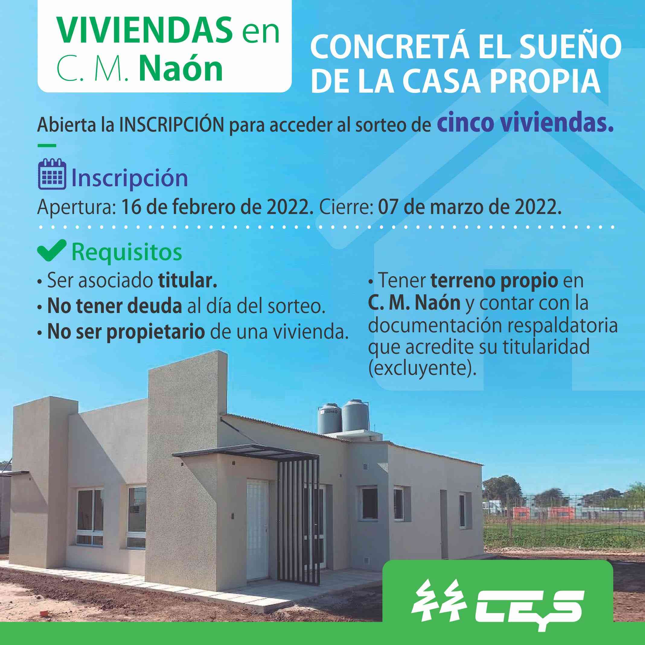 La CEyS “Mariano Moreno” Ltda. comunica a sus asociados que se encuentra abierta la inscripción para acceder al sorteo de cinco (5) viviendas cooperativas en la localidad de Carlos María Naón.