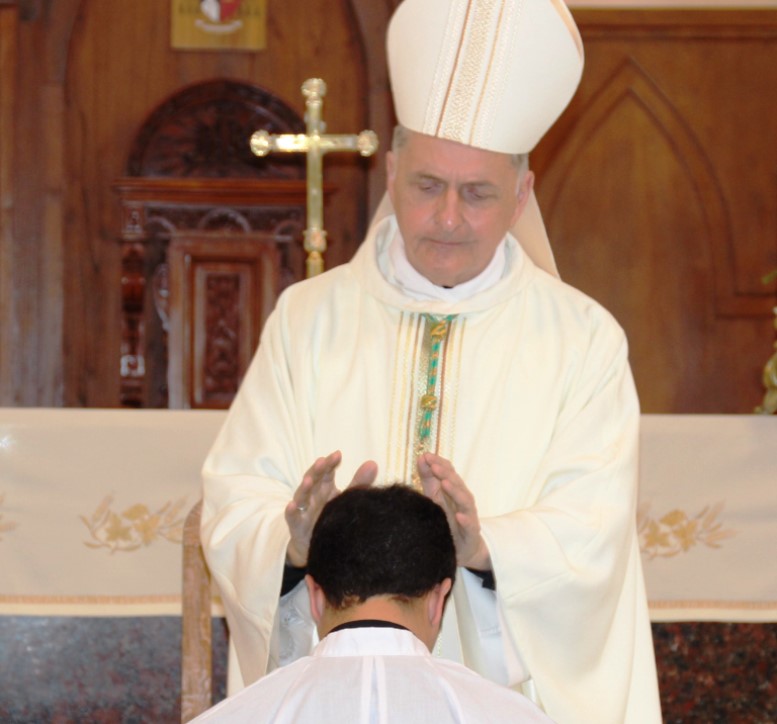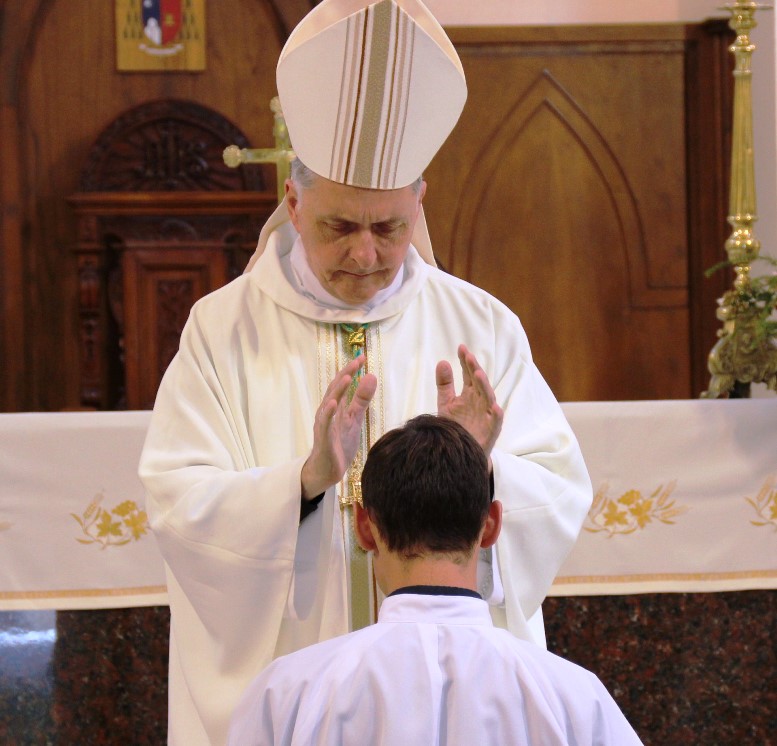 Terminada la homilía se invocó la ayuda divina mediante el canto de las letanías de los santos, a lo cual siguió la imposición de manos y la plegaria de ordenación por parte del Obispo. Una vez ordenados fueron revestidos con los ornamentos propios de su orden como son la estola y la dalmática. Luego recibieron el libro de la Palabra y fueron recibidos por los diáconos presentes con el saludo de la paz.