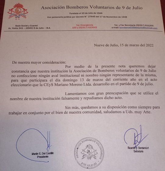 DestacadosElecciones CEyS: Bomberos Voluntarios lamenta que su nombre se utilice falsamenteEn una nota que hizo público su presidente y secretario, repudia el hecho donde ayer se señaló que no se permitía votar a un representante de esa instituciónlunes 14 de marzo de 2022 0FacebookTwitterWhatsAppEmailPrint - Advertisement -- Advertisement -- Advertisement -FacebookTwitterWhatsAppEmailPrint Noticias relacionadas Destacados Hugo Enríquez: “La llegada de la ayuda Nacional con vialidad es una buena noticia; más vale tarde que nunca” Destacados María José Gentile celebra el apoyo del Gobierno Nacional para superar la emergencia hidirca Destacados El Gobierno desplegará un operativo especial en Nueve de Julio para asistir a las zonas anegadas DEJA UNA RESPUESTA Cancelar respuesta Comentario: Por favor ingrese su comentario! Nombre:* Por favor ingrese su nombre aquí Correo electrónico:* ¡Has introducido una dirección de correo electrónico incorrecta! Por favor ingrese su dirección de correo electrónico aquí Sitio web: Guardar mi nombre, correo electrónico y sitio web en este navegador la próxima vez que comente. ΔÚltimas noticias La neumonía mata a 800.000 niños cada año: una enfermedad prevenible que sigue siendo la principal causa de muerte infantil Sociedad miércoles 12 de noviembre de 2025 Día mundial contra la obesidad Efemérides miércoles 12 de noviembre de 2025 Falleció Dante Fava, referente de los Bomberos Voluntarios Sociedad martes 11 de noviembre de 2025 Cuando el agua ahoga, el Estado tira un salvavidas de plomo: el campo bonaerense rechaza el nuevo aumento impositivo Producción martes 11 de noviembre de 2025 Provincia declaró la Emergencia y/o Desastre Agropecuario en Lincoln por las inundaciones General martes 11 de noviembre de 2025