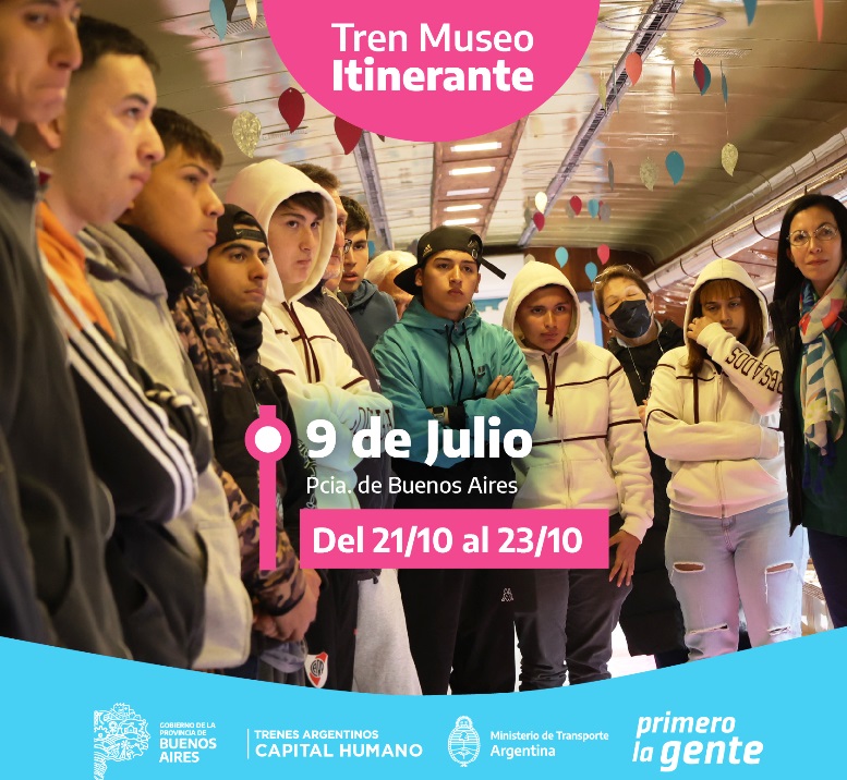 El museo rodante de Trenes Argentinos Capital Humano continúa su viaje este fin de semana en la localidad de 9 de Julio, luego de recibir en poco más de un año de recorrido a casi 140 mil visitantes. La formación abrirá sus puertas en la estación ferroviaria del viernes 21 al domingo 23 de octubre de 10 a 13 y de 14 a 18 hs. con entrada libre y gratuita para toda la familia.