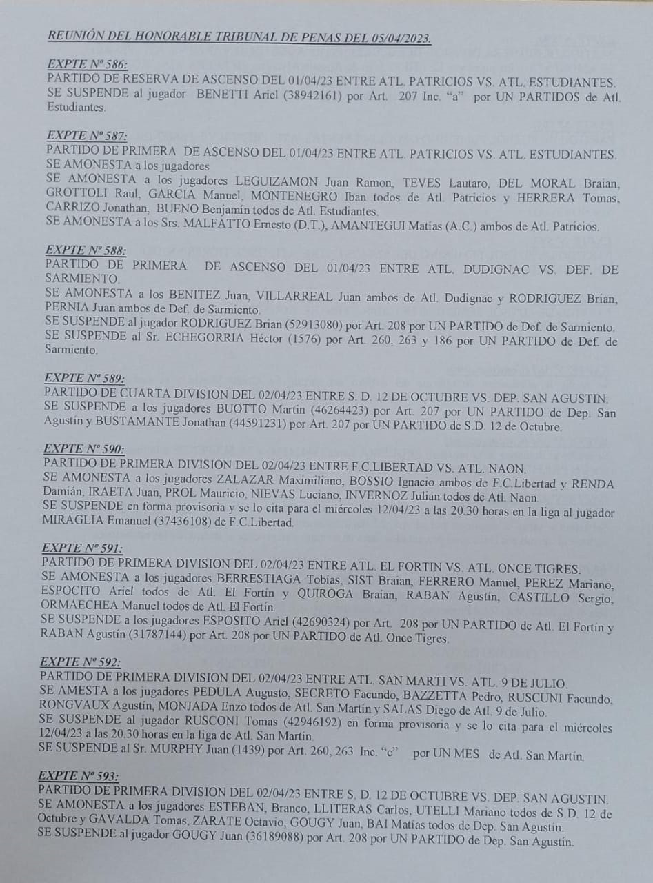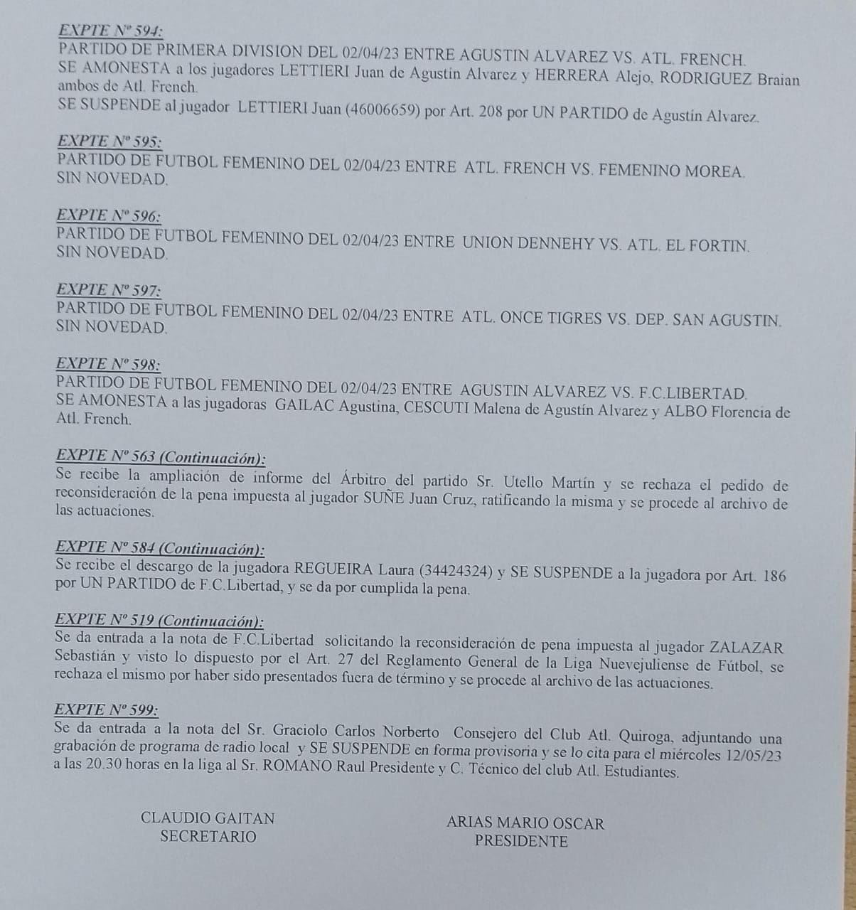 Con la firma de su presidente, Mario Oscar Arias y su secretario, Claudio Gaitán, el Tribunal de Penas de la Liga Nuevejuliense de futbol dio a conocer las resoluciones de los expedientes que se formaron ante los informes arbitrales de los partidos de la última fecha.