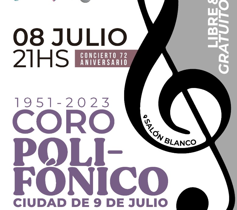 El Coro Polifónico Ciudad de Nueve de Julio habrá de celebrar sus 72 años de ininterrumpida trayectoria en la comunidad con un gran concierto, a desarrollarse mañana, sábado 8 de julio, a las 21 hs., en el Salón Blanco del Palacio Municipal, con entrada libre y gratuita.