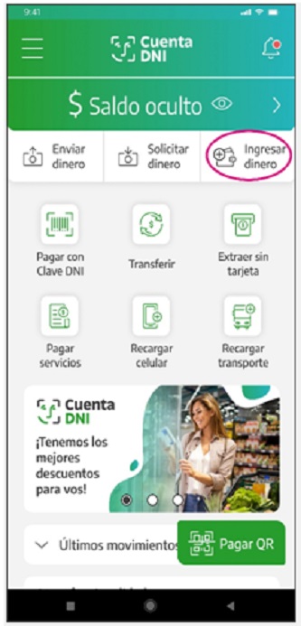 - Ingresar a Cuenta DNI y seleccionar Ingresar dinero.