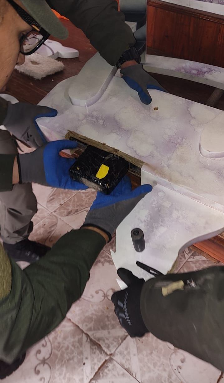 Fue entonces que el personal de la GNA inspeccionó el semirremolque con un scanner portátil, lo que permitió observar elementos extraños dentro de un caballo mecedor de madera. Además, “Mara”, perra detectora de narcóticos confirmó la presencia de droga en la encomienda, por lo que se dio intervención a la Unidad Fiscal Federal de Jujuy, que autorizó la apertura del juguete: de su interior se extrajeron tres paquetes rectangulares que contenían 3,139 kilogramos de cocaína, los cuales fueron decomisados.