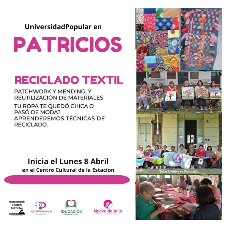 La Universidad Popular de Nueve de Julio, llevará adelante a partir del lunes 8 de abril, a las 13,30 hs., en el Centro Cultural de la localidad de Patricios, u n interesante taller de Reciclado Textil, a cargo de Mariel Amestoy.