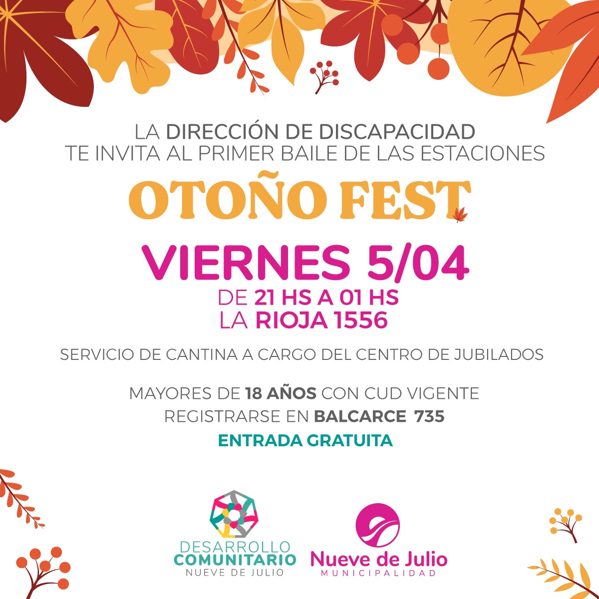 La dirección de Discapacidad de la Municipalidad de Nueve de Julio, dependiente de la secretaría de Desarrollo Comunitario, invita al primer baile de las estaciones “Otoño Fest”, que se llevará a cabo el viernes 5 de abril, de 21 a 01 hs. en el salón del Centro de Jubilados de calle La Rioja 1556 y servicio de cantina a cargo de esta entidad.