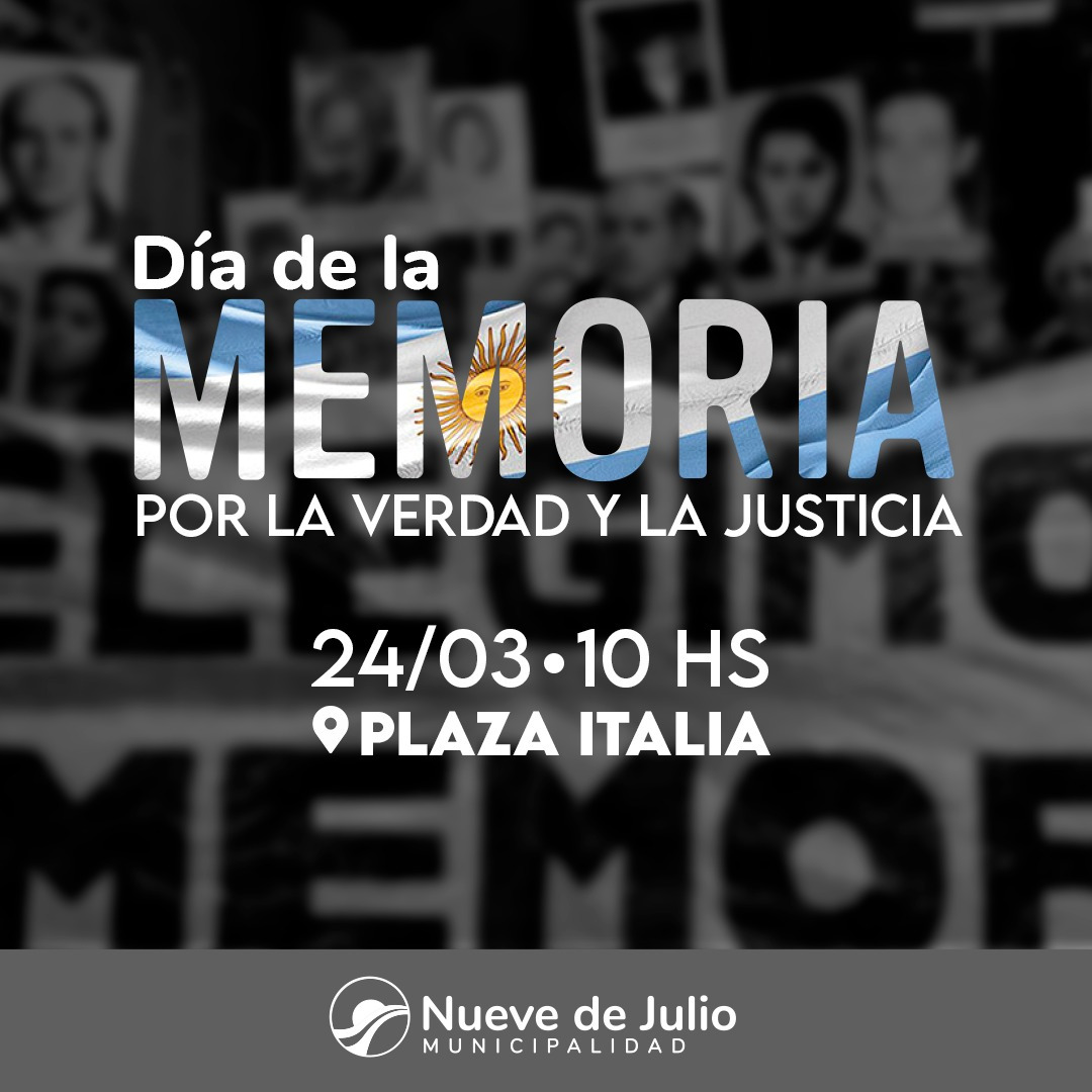 Con motivo de conmemorarse este próximo domingo 24 el Día Nacional de la Memoria por la Verdad y la Justicia, a 48 años del inicio de la última dictadura militar, la Municipalidad de Nueve de Julio desarrollará en la fecha los actos oficiales, que tendrán lugar a partir de las 10 hs. en Plaza Italia.