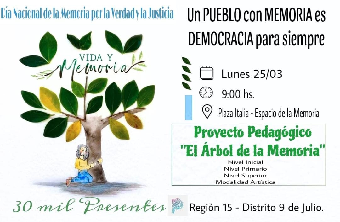 Un proyecto pedagógico que alcanza a todos los niveles de la Educación en el distrito de Nueve de Julio se podrá ver en plaza Italia este lunes 25 de marzo desde las 9 de la mañana relacionado con el Día Nacional de la Memoria, la Verdad y la Justicia, con la consigna ‘Un pueblo con memoria es democracia para siempre’.