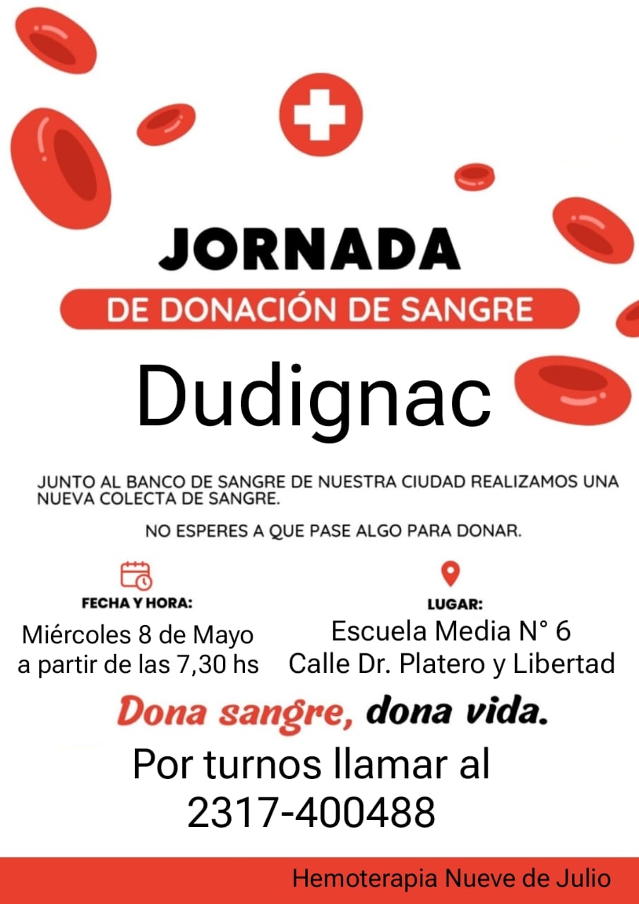 Dudignac se prepara para una jornada solidaria que puede marcar la diferencia en muchas vidas! Este miércoles 8, la Escuela Secundaria N° 6 abrirá sus puertas desde las 7 de la mañana para llevar a cabo una colecta de sangre que promete ser un acto de generosidad y compromiso con la comunidad.