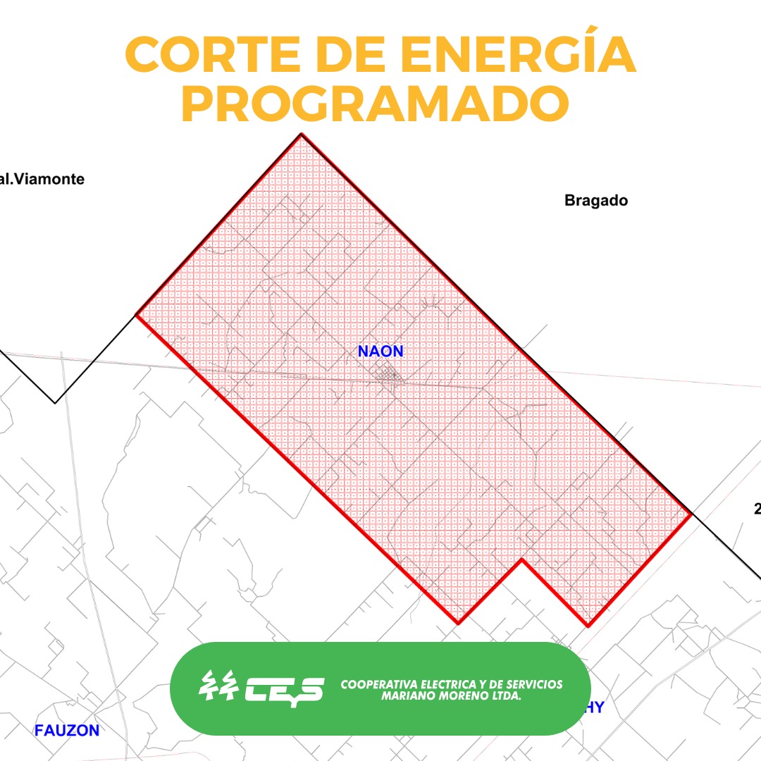 Este Jueves 8 de Agosto del 2024 -en el horario de 09:00 a 13:00 hs- se producirá un corte de energía programado por tareas de mantenimiento (zona delimitada en imagen con líneas ROJAS).