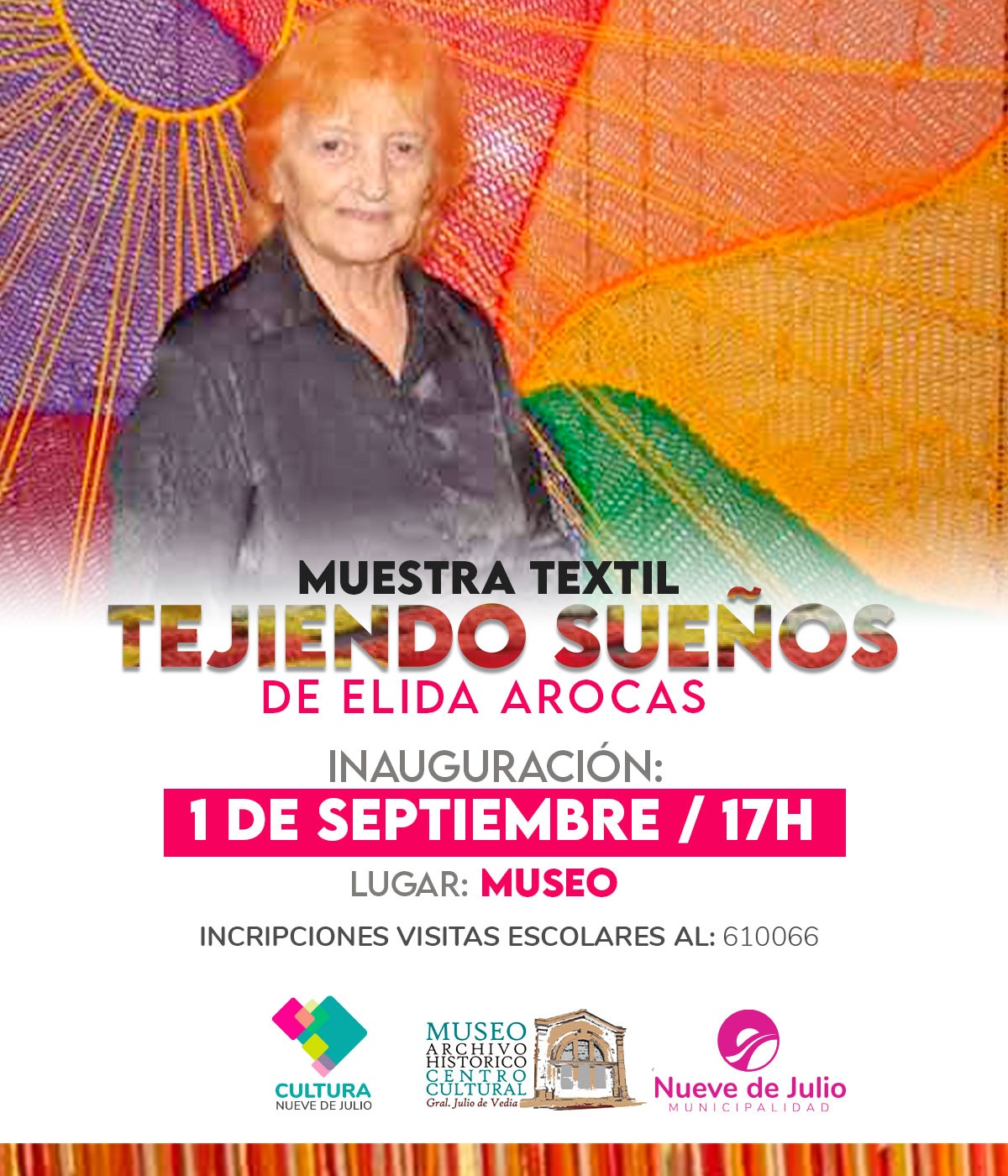 El domingo 1 de septiembre, a las 17 hs., se inaugurará la muestra “Tejiendo Sueños” en el Museo, Archivo Histórico y Centro Cultural “Julio de Vedia”, ubicado en Av. Cardenal Pironio y Edison. La exposición está a cargo de la destacada artista textil de Nueve de Julio, Elida Aroca, y marcará el cierre de su trayectoria artística en 2024.