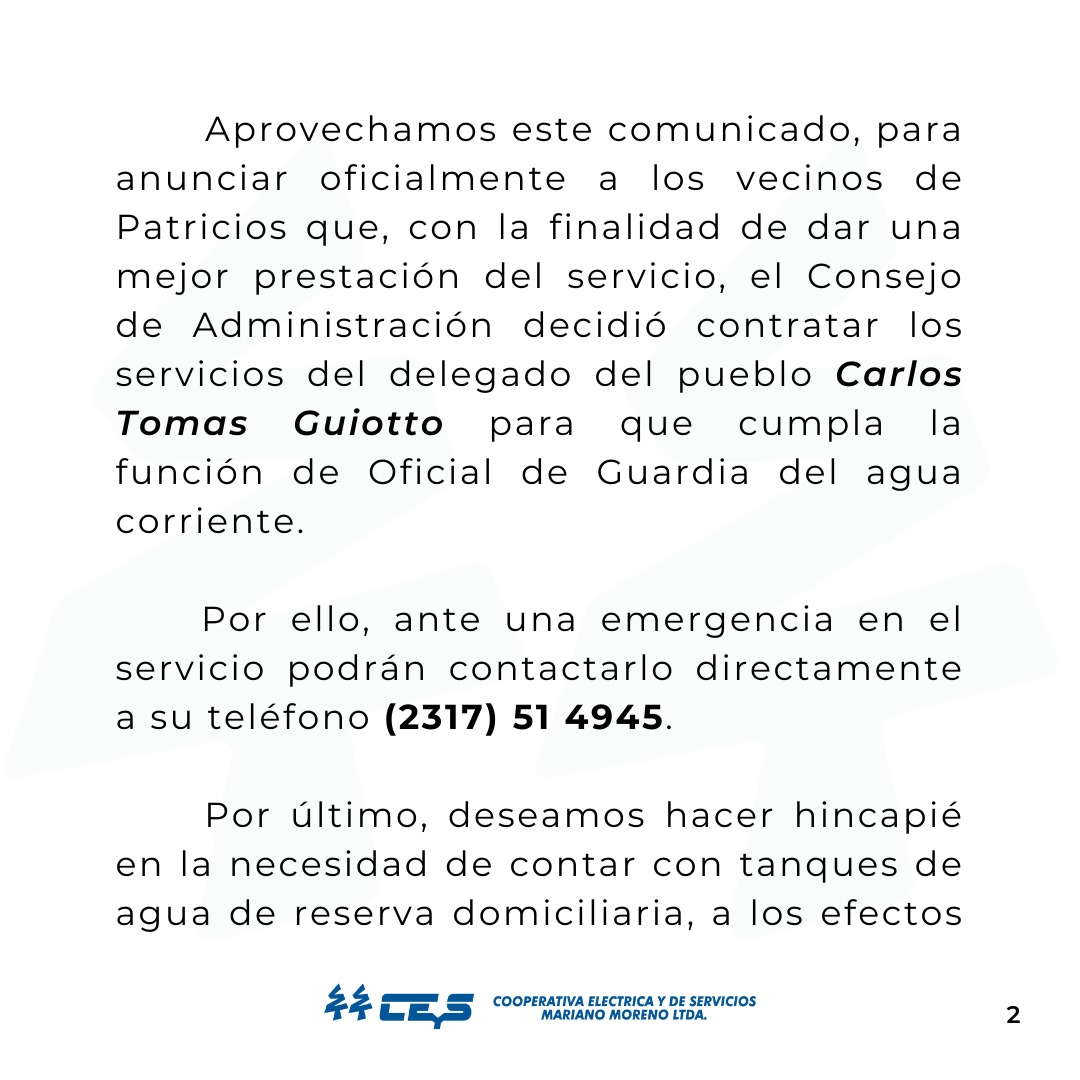 Aprovechamos este comunicado, para anunciar oficialmente a los vecinos de Patricios que, con la finalidad de dar una mejor prestación del servicio, el Consejo de Administración decidió contratar los servicios del delegado del pueblo Carlos Tomas Guiotto, para que cumpla la función de Oficial de Guardia del agua corriente.