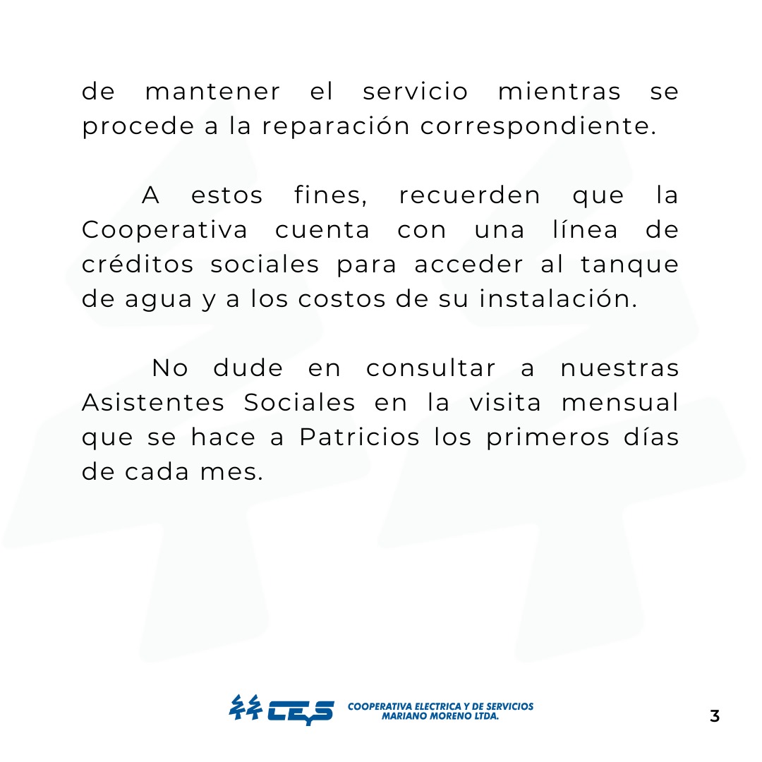 A estos fines, recuerden que la Cooperativa cuenta con una línea de créditos sociales para acceder al tanque de agua y a los costos de su instalación.