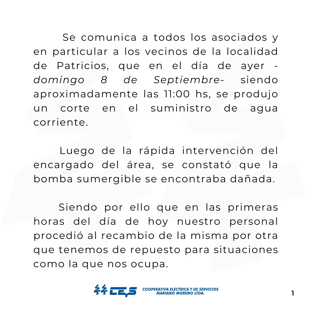 Se comunica a todos los asociados y en particular a los vecinos de la localidad de Patricios, que en el día de ayer -domingo 8 de Septiembre- siendo aproximadamente las 11:00 hs, se produjo un corte en el suministro de agua corriente.