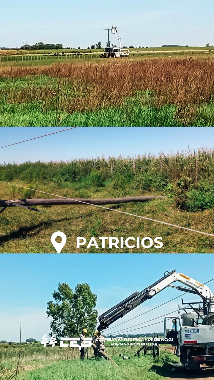 Las cuadrillas de la Guardia Eléctrica de la Cooperativa Eléctrica y de Servicios (CEyS) continúan trabajando arduamente para restablecer el servicio eléctrico en la localidad de Patricios, afectada por los daños causados por la reciente tormenta que azotó la región.