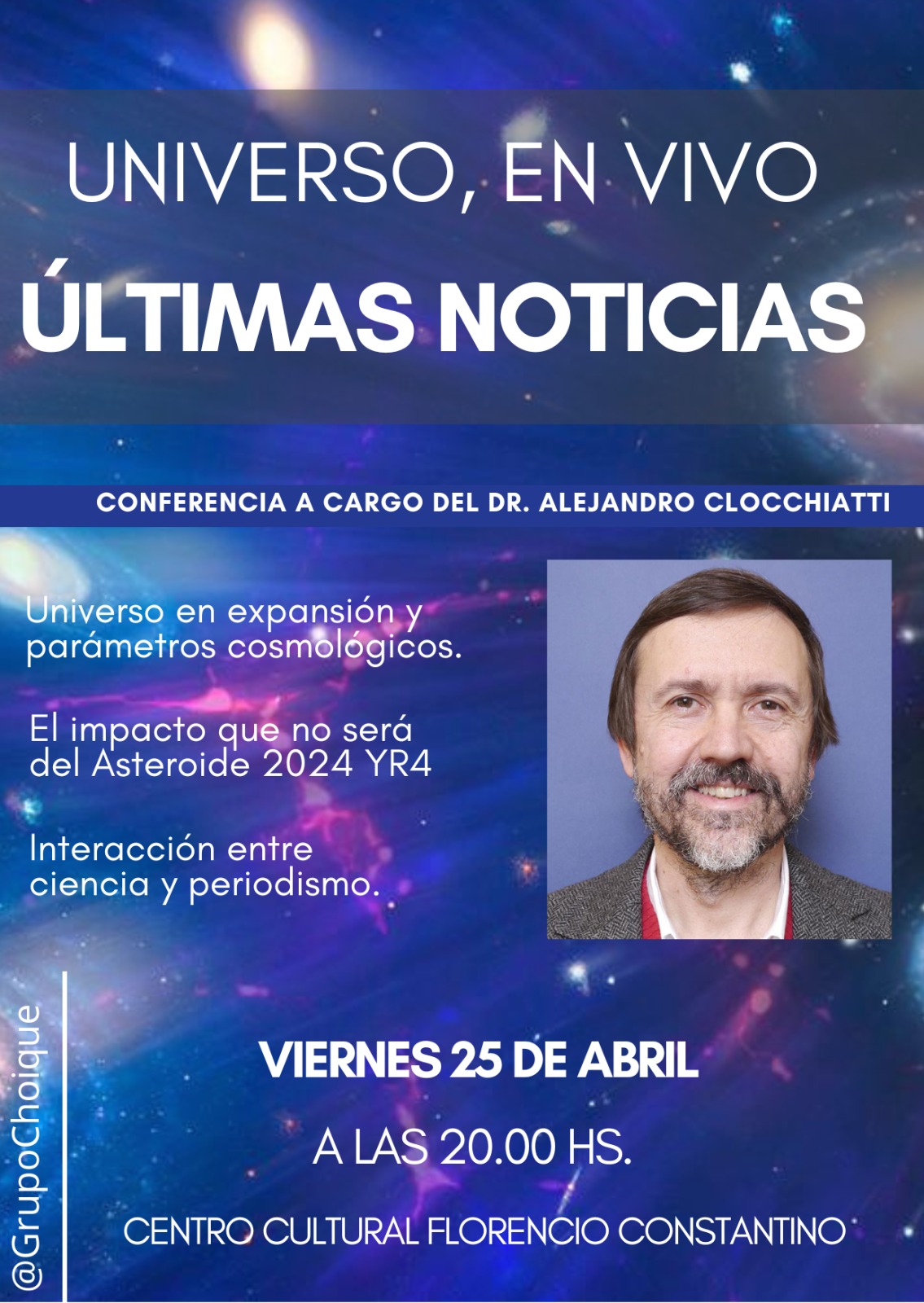 El Grupo Astronómico Choique Bragado anunció la conferencia «Universo en Vivo: Últimas Noticias», que estará a cargo del prestigioso científico. El evento se llevará a cabo el viernes 25 de abril de 2025 a las 20:00 horas en el Micro Cine del Centro Cultural Florencio Constantino, ubicado en Belgrano 1260, Bragado. La entrada será libre y gratuita, y el acontecimiento ha sido declarado de interés legislativo municipal por el Decreto 2485/23.
