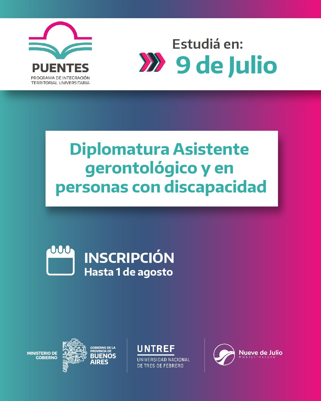 En el marco del Programa “Puentes” impulsado por el gobierno bonaerense para acercar la educación superior a los municipios, se encuentra abierta la inscripción para la Diplomatura en Asistencia Gerontológica y Personas con Discapacidad, que comenzará a dictarse en el partido de 9 de Julio a partir del 15 de agosto.