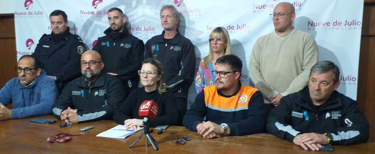 En una conferencia de prensa realizada en la tarde este lunes en el Salón de las Américas del Palacio Comunal, la intendenta de Nueve de Julio, María José Gentile, abordó en detalle la grave crisis hídrica que atraviesa el distrito. Estuvo acompañada por el Director Provincial de Defensa Civil, Fabián García, el Secretario de Obras y Servicios Públicos, Juan Pablo Boufflet, el Director de Defensa Civil distrital, Jonatan martini, el Secretario de Gobierno, Federico Aranda, la Secretaria de Desarrollo Comunitario, María Márquez y otros funcionarios del ámbito provincial.