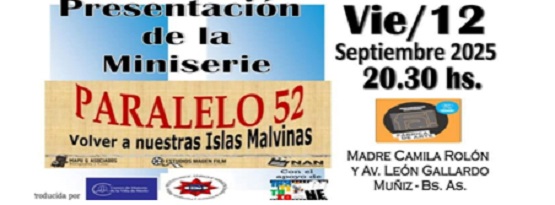 Son ocho episodios que recorren la historia, el presente y el futuro de la causa Malvinas, con la fuerza de quienes saben que la soberanía no se mendiga, se defiende. El próximo viernes 12 de septiembre, a las 20:30 hs, en San Miguel (Buenos Aires), se realizará la presentación pública de esta obra, con entrada libre y gratuita. El evento ha sido declarado de Interés Cultural, Educativo y de Reafirmación de la Soberanía por el Concejo Deliberante de San Miguel, el Concejo Deliberante de la Villa de Merlo (San Luis), la Cámara de Senadores y la Cámara de Diputados de la provincia de San Luis, y por el Ministerio de Turismo y Cultura de esa misma provincia.
