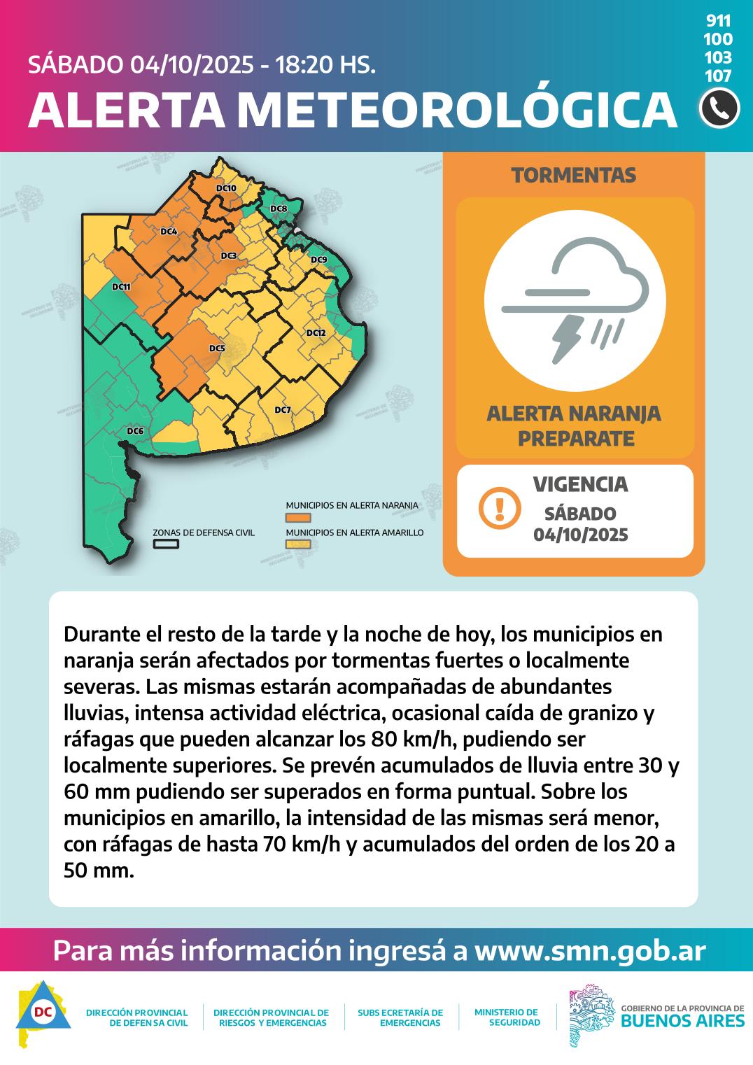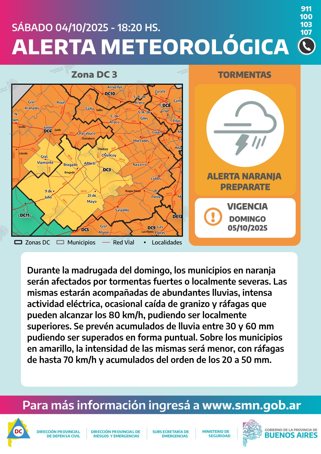 El Servicio Meteorológico Nacional ha emitido una alerta naranja para las zonas DC 3 debido a la presencia de tormentas severas que afectarán la región durante las próximas horas. Alcanza a Nueve de Julio s se esperan lluvias intensas y tormentas de variada intensidad, algunas localmente fuertes durante la tarde, con un aumento significativo hacia la noche.