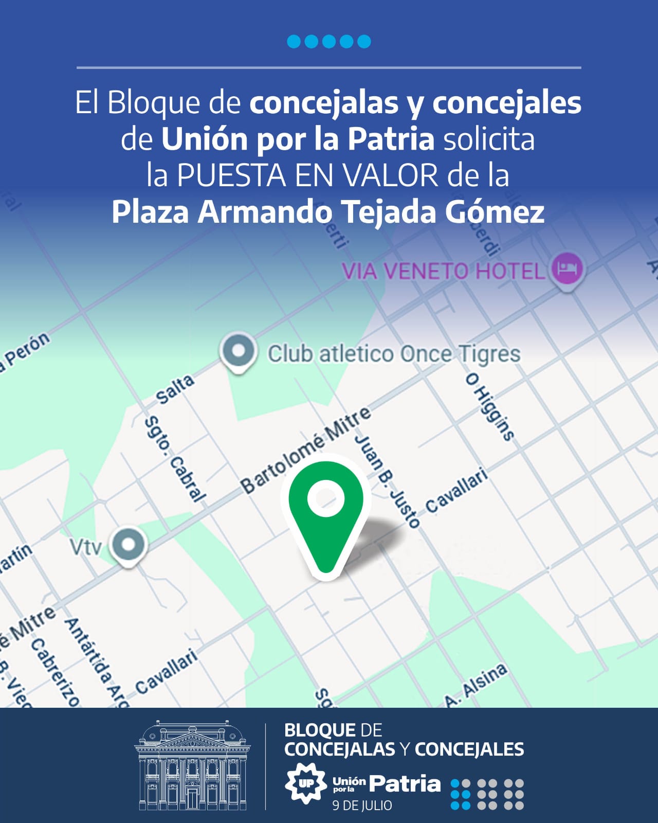 El Bloque de Concejalas de Unión por la Patria presentó un Proyecto de Comunicación en el Concejo Deliberante de Nueve de Julio, solicitando la puesta en valor de la Plaza Armando Tejeda Gómez, situada en la intersección de las calles Cavallari y Blas Parera de la ciudad.