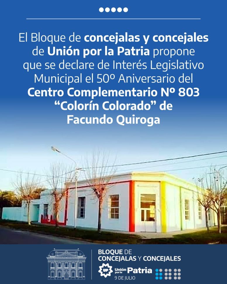 Mediante un proyecto de resolución, el Bloque de concejalas de Unión por la Patria pone a consideración del cuerpo legislativo, declarar de Interés legislativo Municipal el Acto Aniversario 50° del Centro Educativo Complementario 803 Colorín Colorado de Facundo Quiroga.