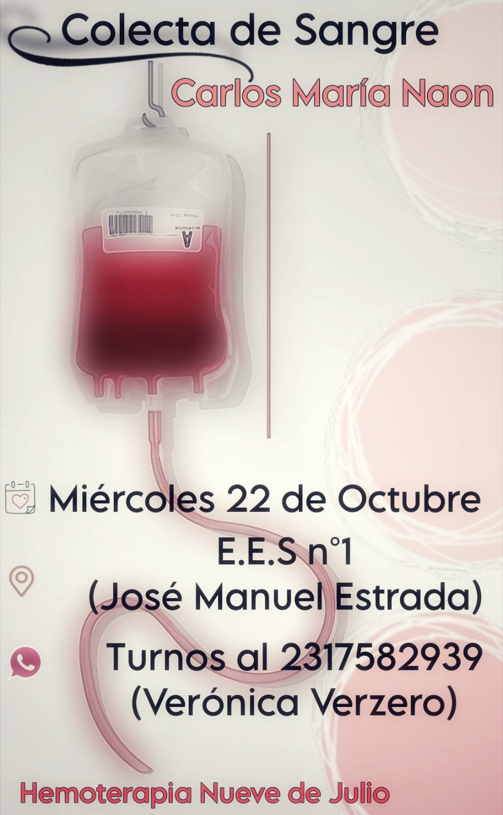 El próximo miércoles 22 de octubre, la Escuela Secundaria José Manuel Estrada de Carlos María Naón será escenario de una importante jornada de donación de sangre. La actividad, organizada en conjunto con el Servicio de Hemoterapia del Hospital Nueve de Julio, tiene como objetivo fomentar la solidaridad y ayudar a quienes más lo necesitan, ya que la donación de sangre es un acto fundamental para salvar vidas.