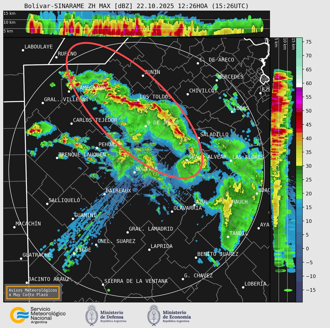 Las tormentas continúan desarrollándose sobre el noroeste de la Provincia de Buenos Aires, especialmente en la zona de Los Toldos, donde la actividad eléctrica es más fuerte. Aunque los acumulados de lluvia aún no son significativos, se espera que en cortos períodos de tiempo se registren acumulados de entre 5 y 15 mm.