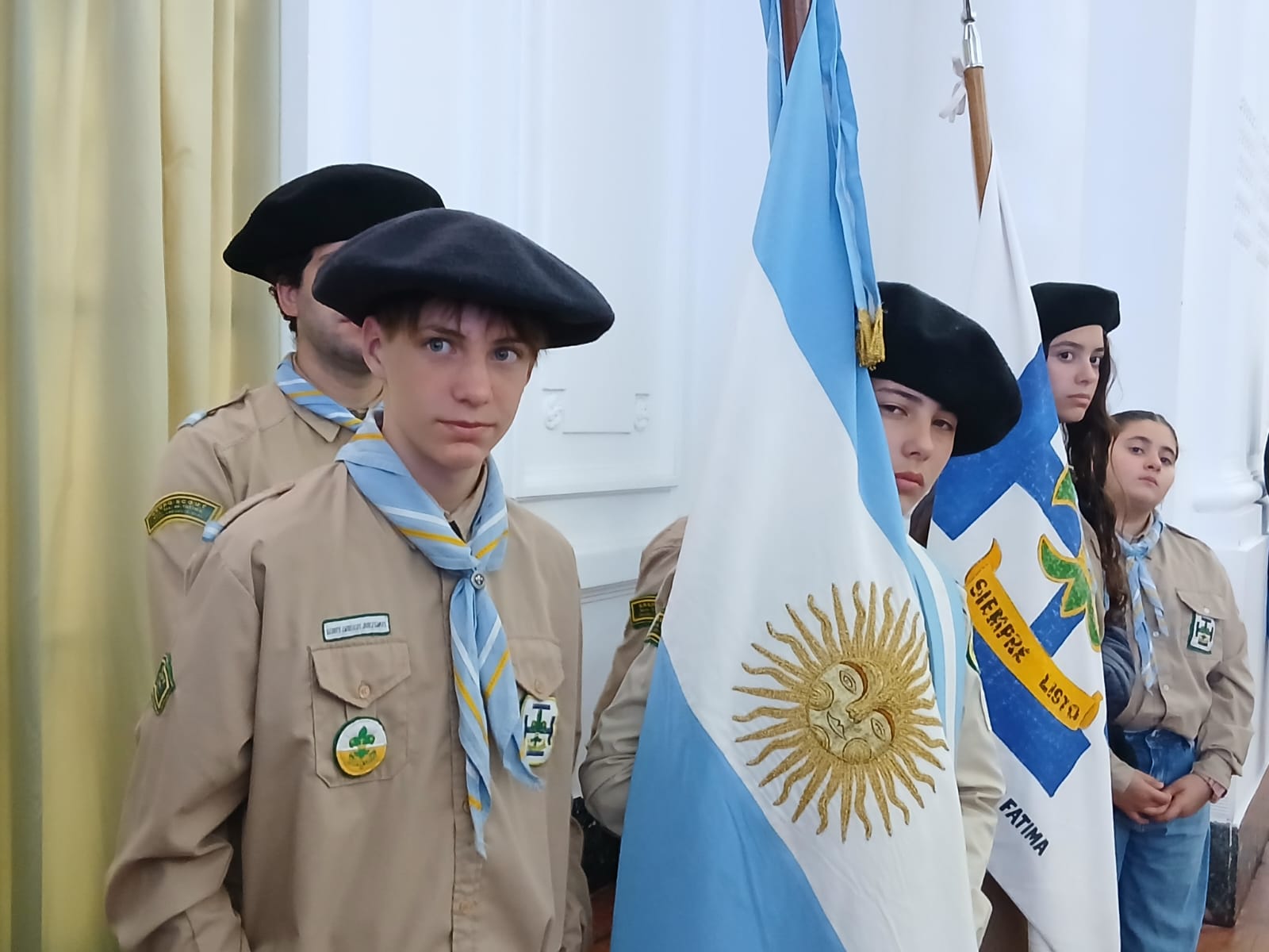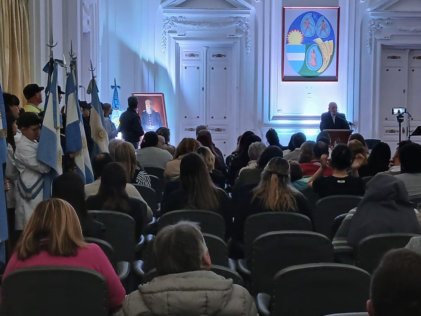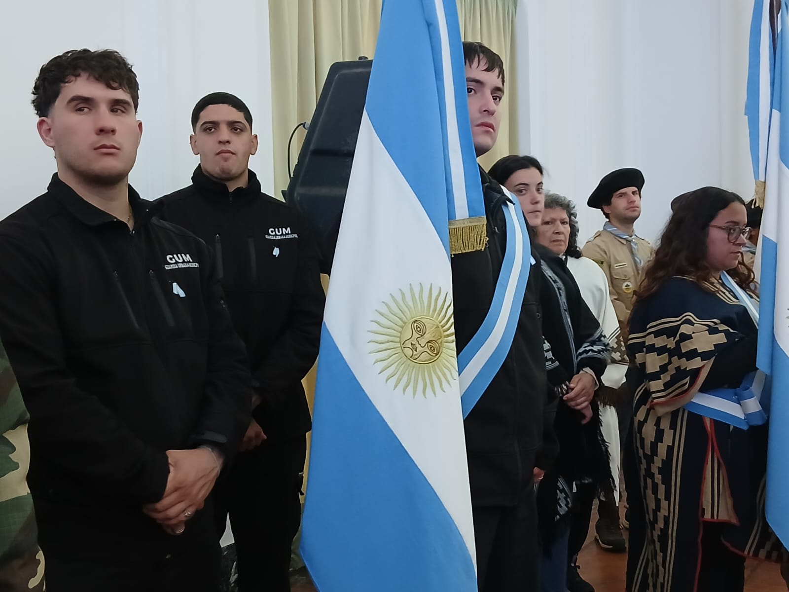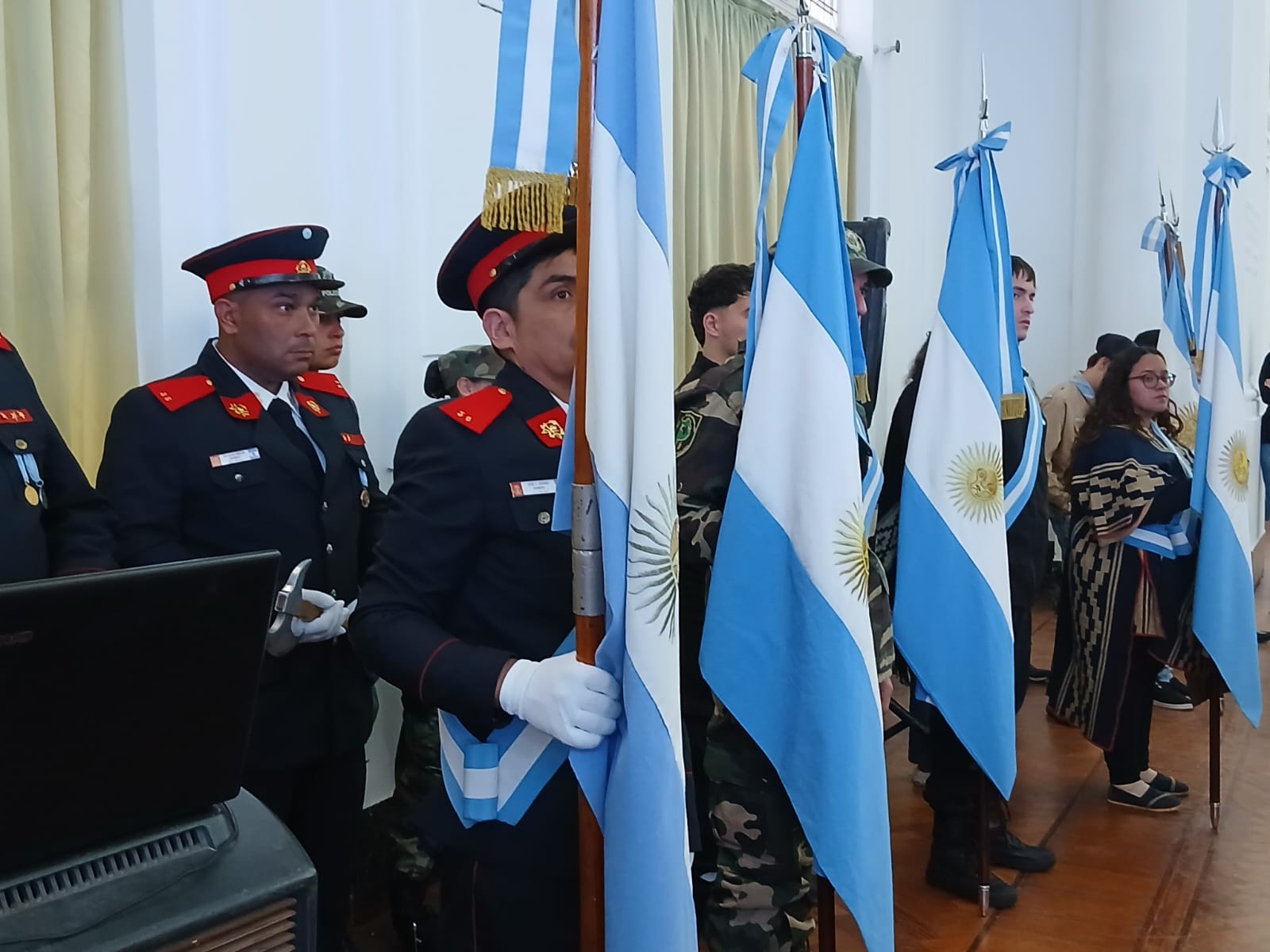 El evento comenzó con el tradicional izamiento de banderas, con la participación de diversas instituciones locales, incluyendo la Policía Comunal, Bomberos Voluntarios, y colegios de la ciudad. A continuación, los presentes entonaron las estrofas del Himno Nacional Argentino, dando inicio formal al acto.