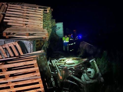 El choque, ocurrido alrededor de las 23:30 horas, involucra a tres camiones, uno de los cuales terminó volcando y dispersando su carga sobre la calzada.