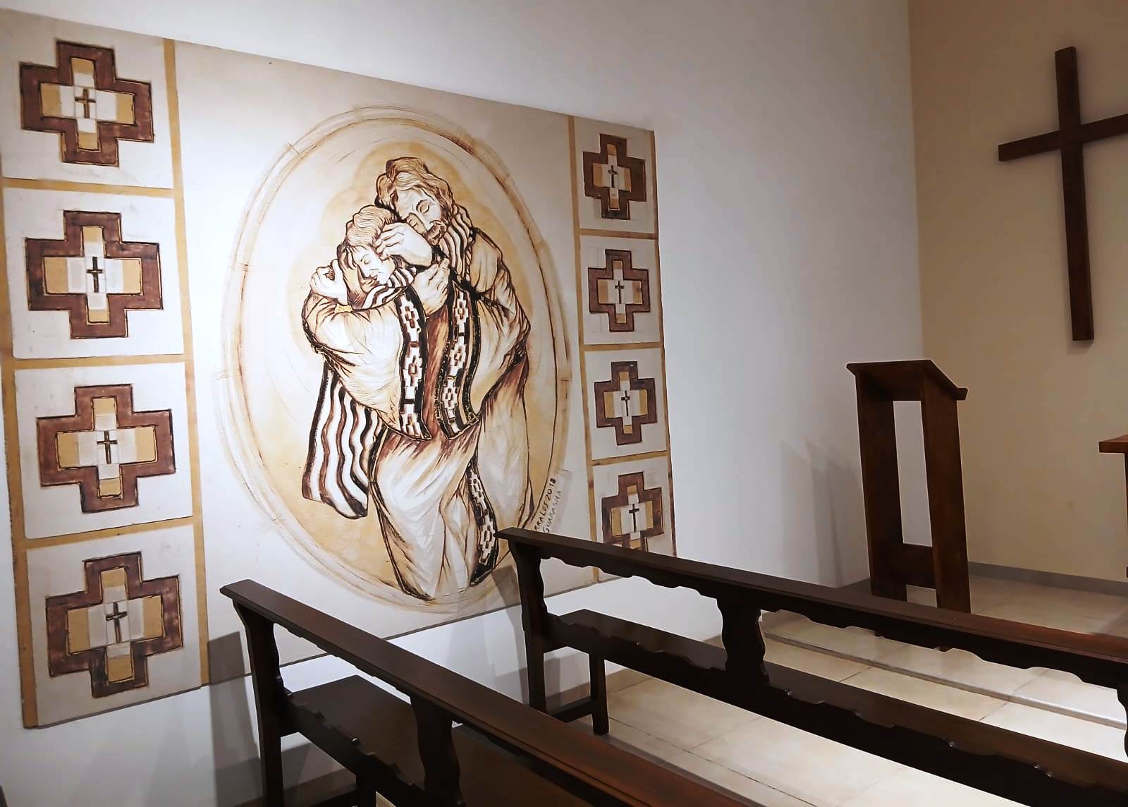 En la pared izquierda de la capilla cinerario, hay una obra que representa el abrazo cristiano entre el hombre y Cristo tras su muerte, un símbolo de misericordia y resurrección.