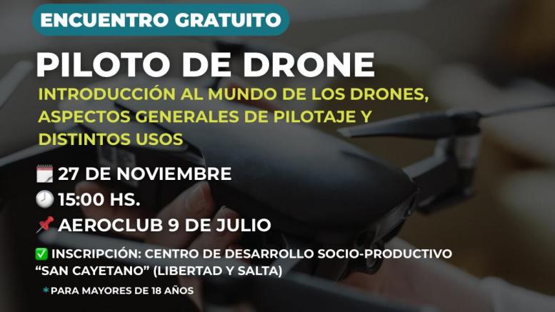 La Municipalidad de Nueve de Julio, a través del Centro de Desarrollo Socio Productivo “San Cayetano”, invita a participar del encuentro gratuito “Piloto de Drone”, una jornada introductoria al mundo de los drones, sus aspectos generales de pilotaje y los distintos usos que esta tecnología ofrece.
