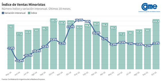 La Confederación Argentina de la Mediana Empresa (CAME) publicó su informe mensual sobre el desempeño de las ventas minoristas pymes, donde se destacó una caída interanual de 1,4% en octubre, a precios constantes. Sin embargo, en la comparación mensual desestacionalizada, se observó un aumento del 2,8%. En términos acumulados, las ventas minoristas pymes crecen un 4,2% interanual en lo que va del año.