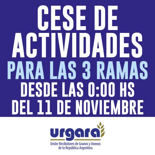 La Unión de Recibidores de Granos y Anexos de la República Argentina (URGARA) ha decidido comenzar una serie de medidas gremiales a partir de la medianoche del martes 11 de noviembre de 2025. La medida de fuerza abarcará puertos, acopios y empresas del sector agroexportador de todo el país, ante la falta de respuestas concretas por parte de las cámaras empresarias de las tres ramas de la actividad: Acopio, Control y Puertos Privados.