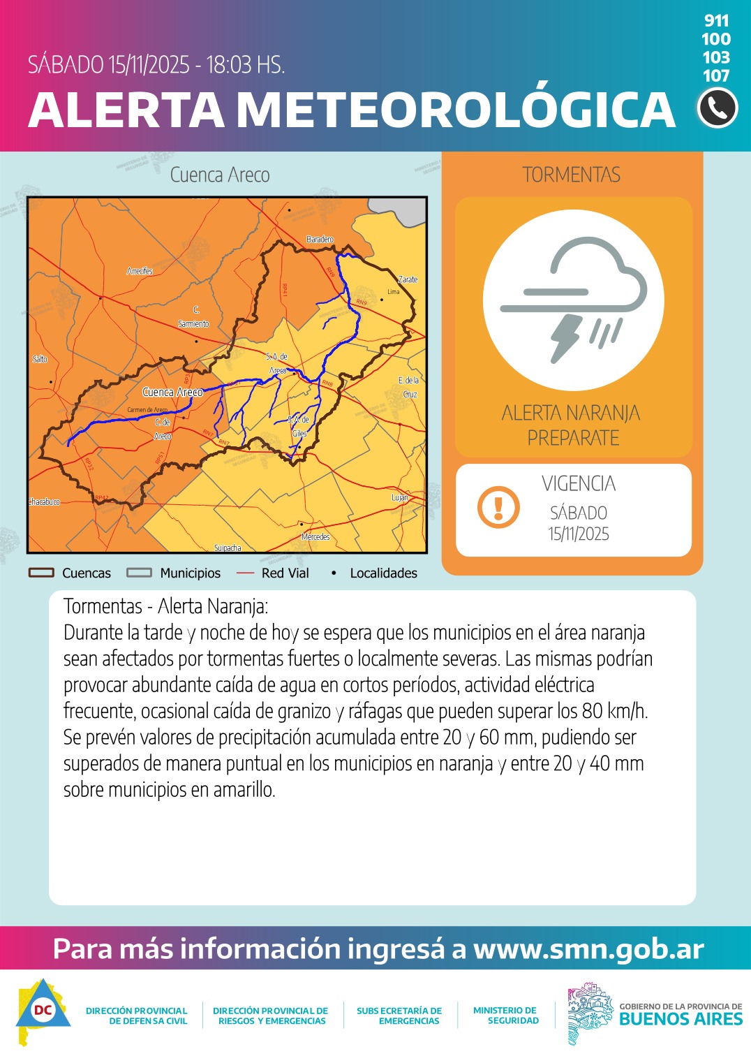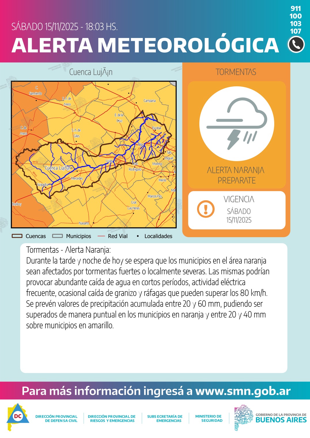 A partir de la tarde-noche, se anticipan lluvias y tormentas de diversas intensidades que se desplazarán de oeste a este. Las tormentas podrán ser de carácter fuerte, con caída de granizo, intensas descargas eléctricas y ráfagas de viento que podrían superar los 80 km/h, especialmente en la zona DC 10 entre las 20:00 y las 24:00 horas.