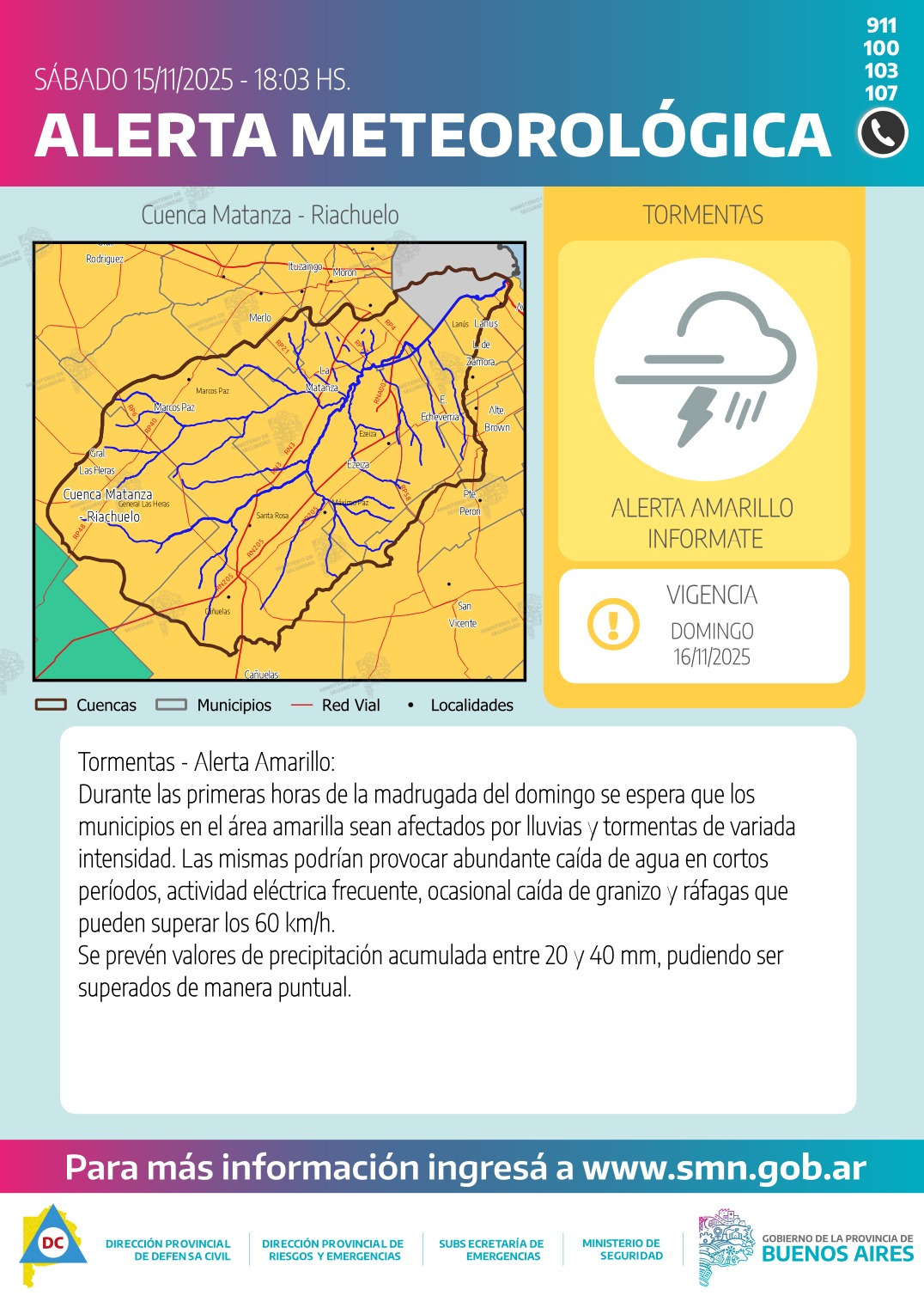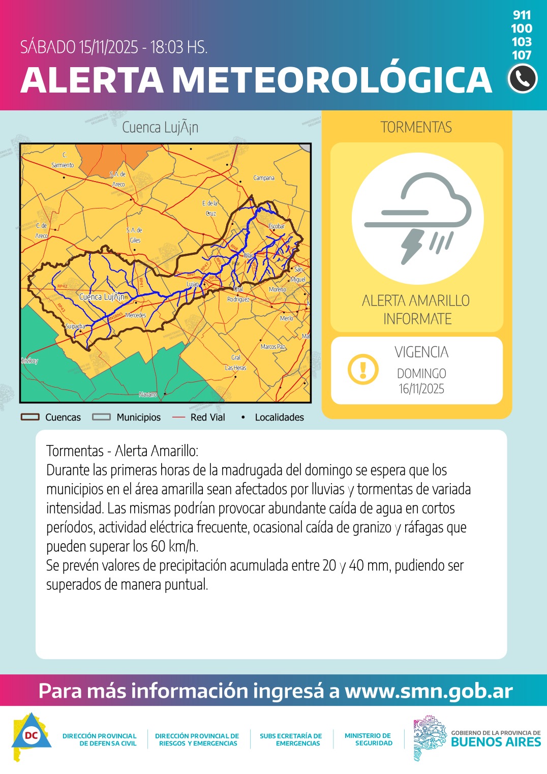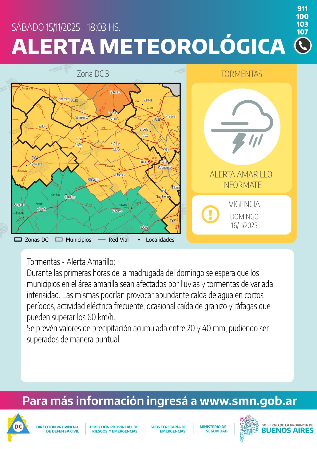 A partir de la tarde-noche, se anticipan lluvias y tormentas de diversas intensidades que se desplazarán de oeste a este. Las tormentas podrán ser de carácter fuerte, con caída de granizo, intensas descargas eléctricas y ráfagas de viento que podrían superar los 80 km/h, especialmente en la zona DC 10 entre las 20:00 y las 24:00 horas.
