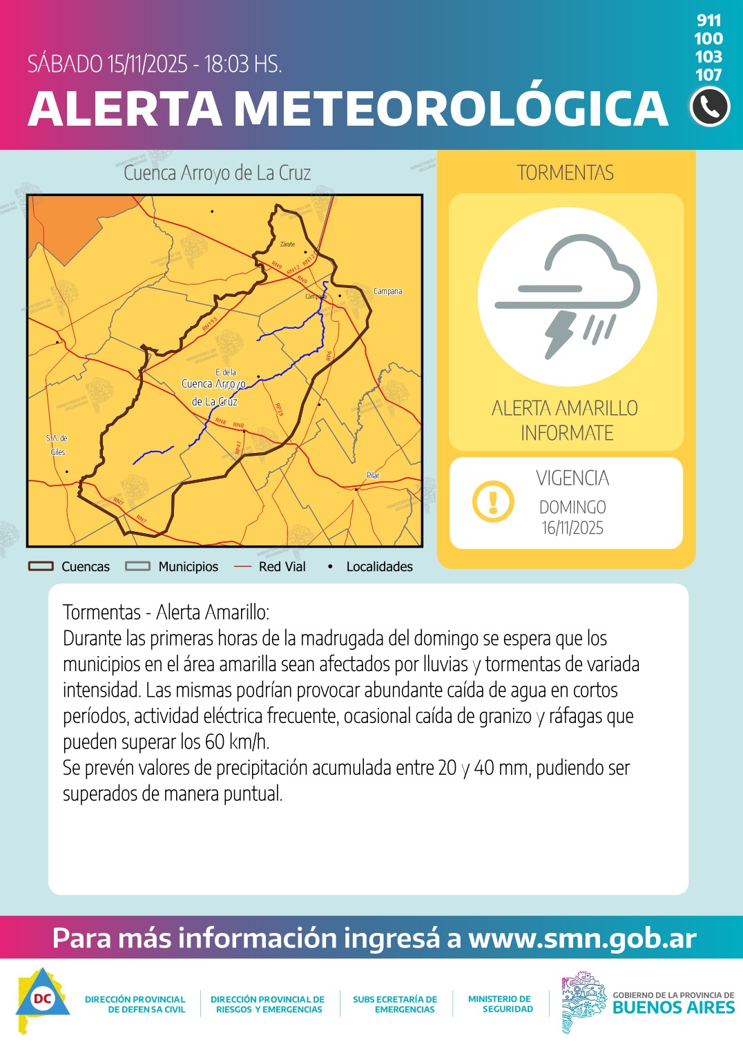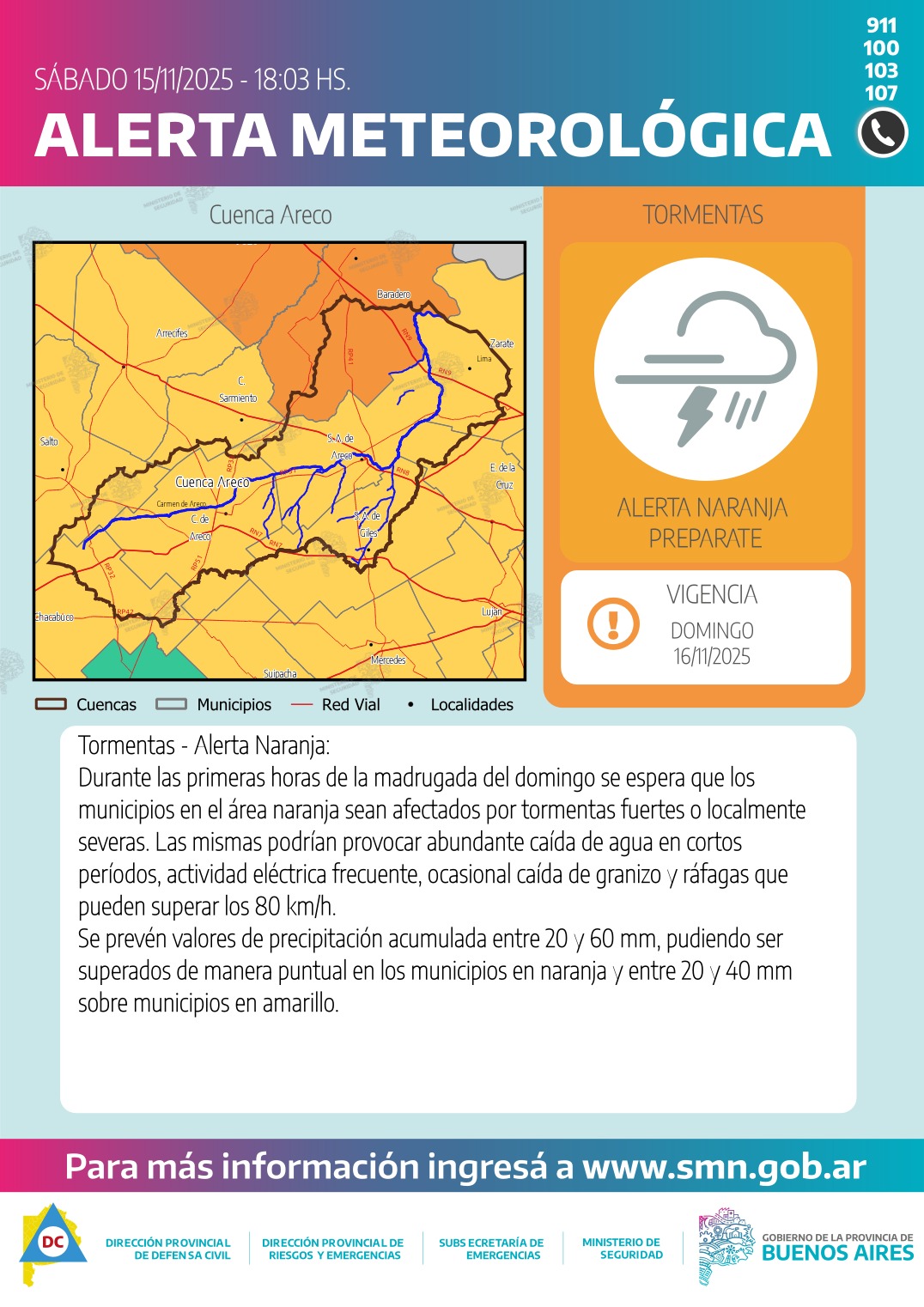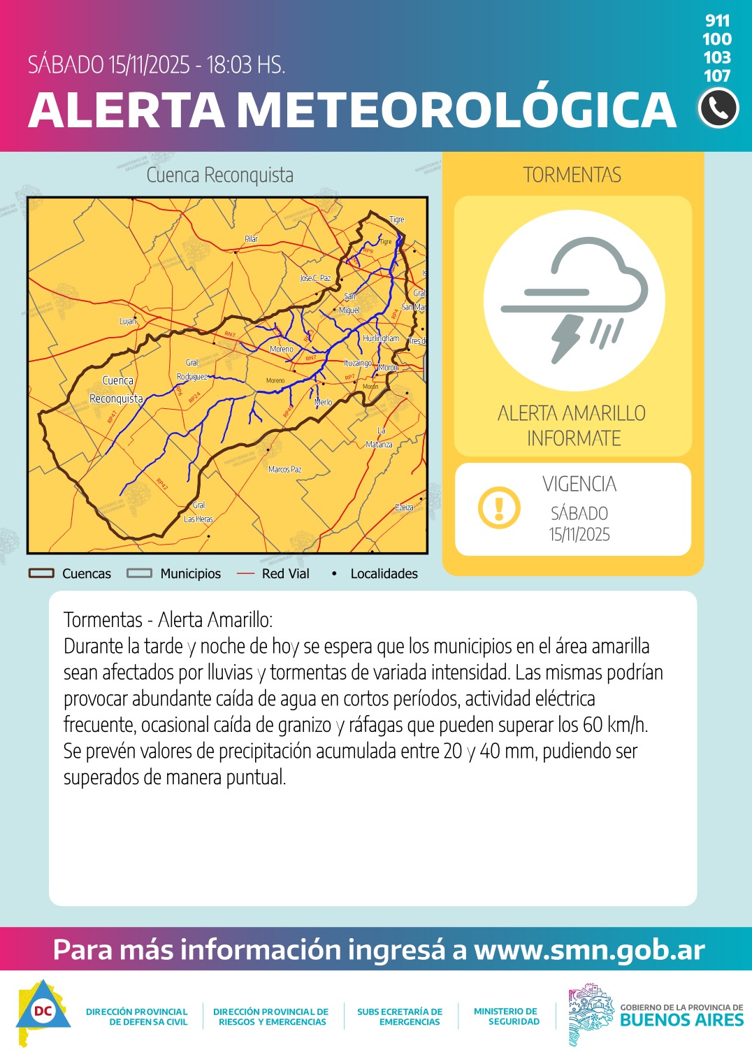 A partir de la tarde-noche, se anticipan lluvias y tormentas de diversas intensidades que se desplazarán de oeste a este. Las tormentas podrán ser de carácter fuerte, con caída de granizo, intensas descargas eléctricas y ráfagas de viento que podrían superar los 80 km/h, especialmente en la zona DC 10 entre las 20:00 y las 24:00 horas.